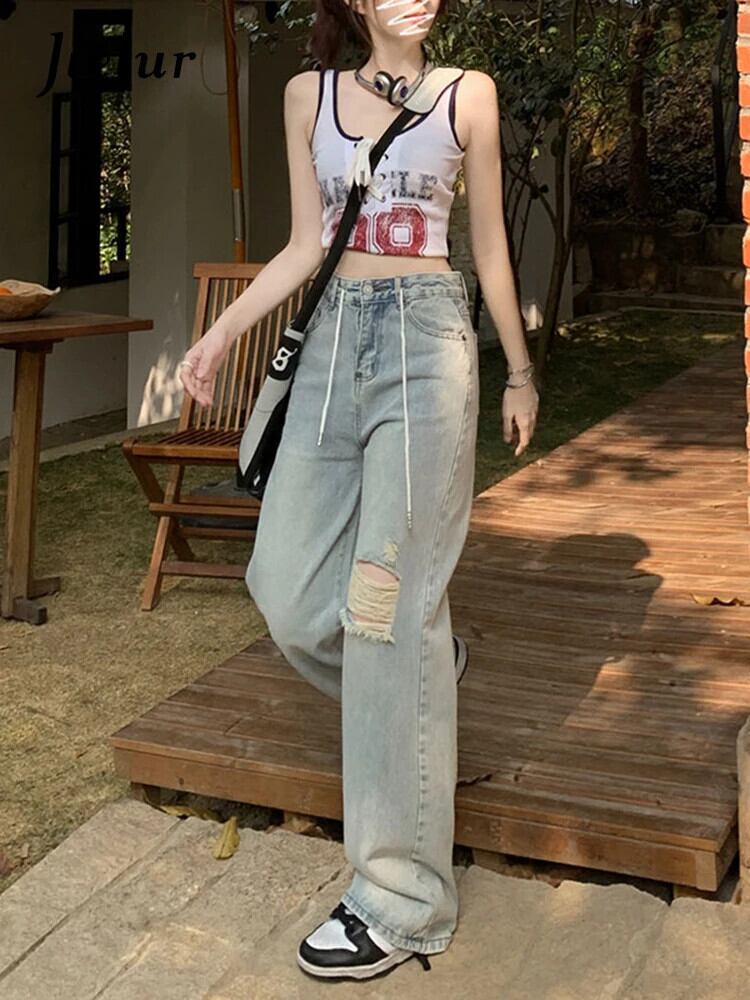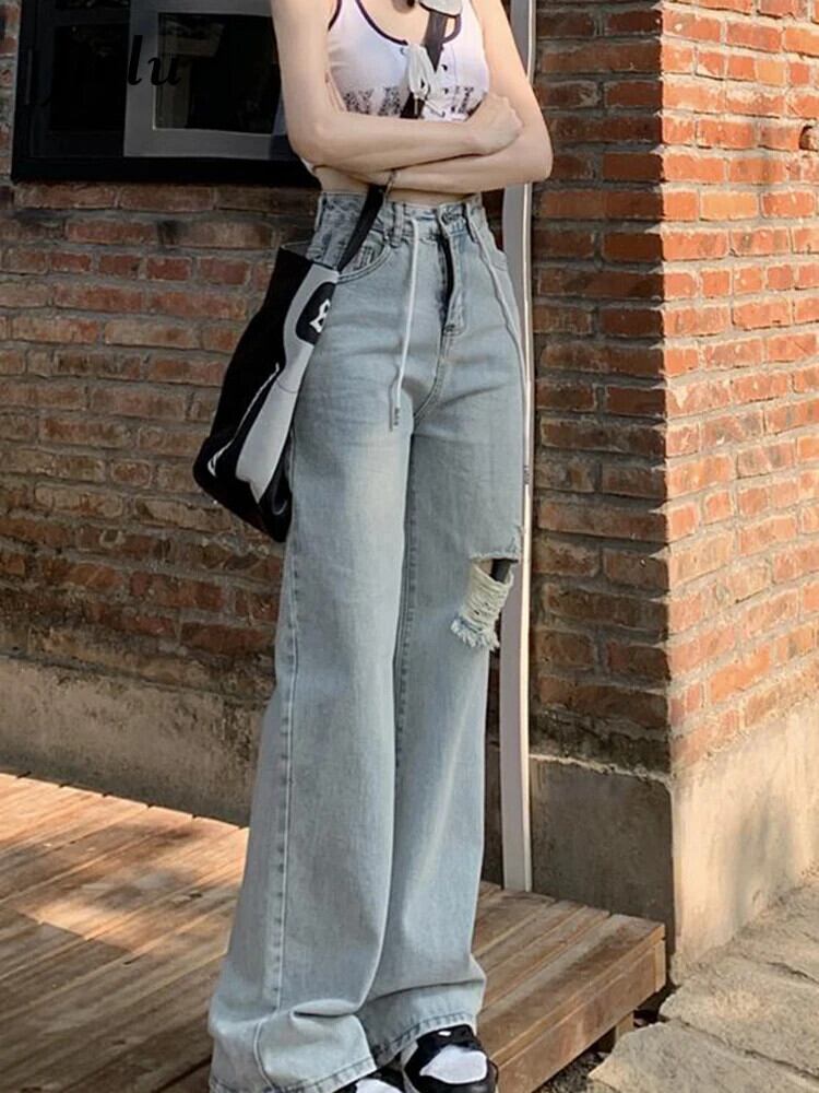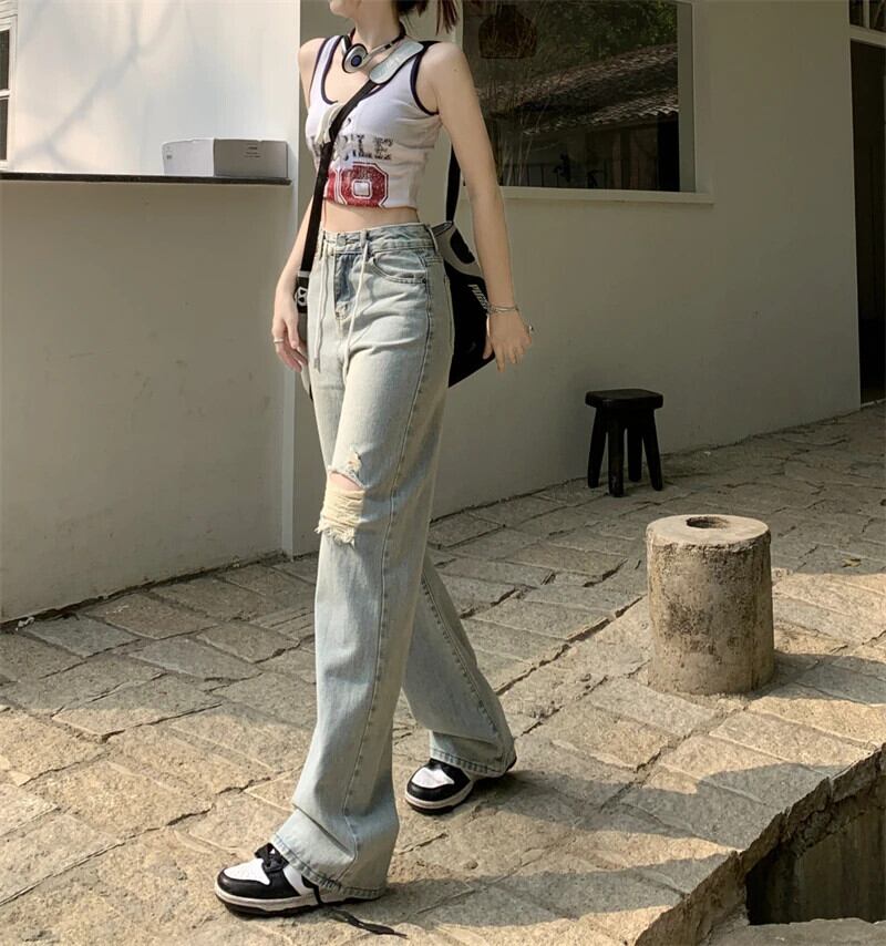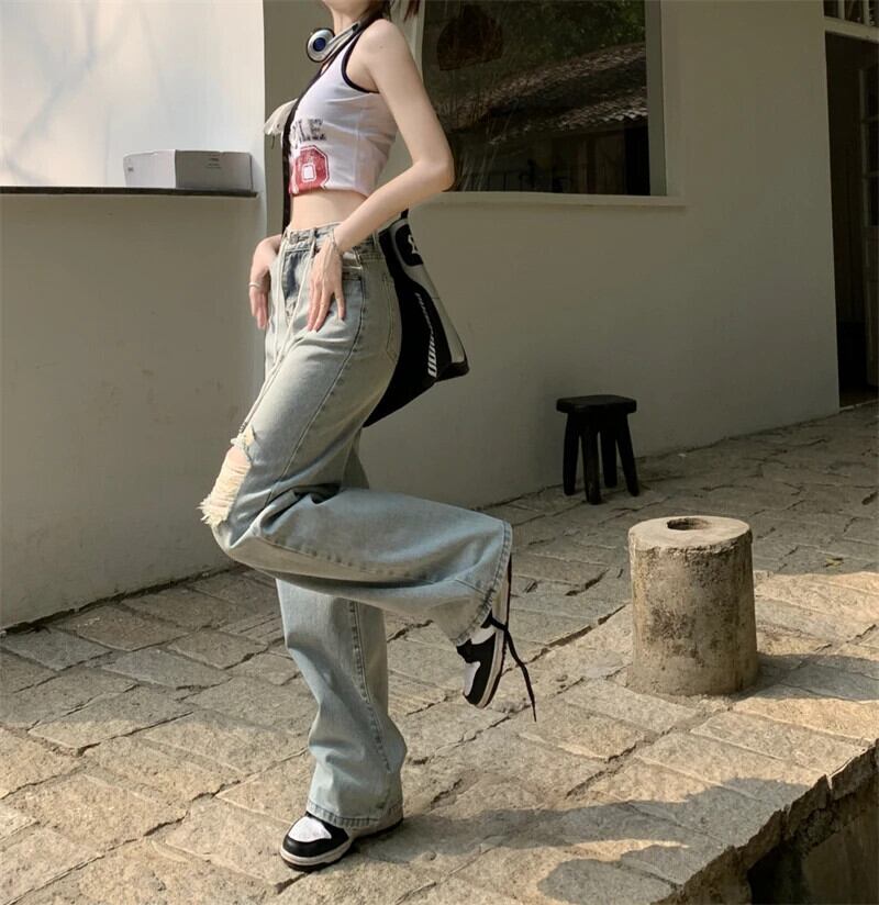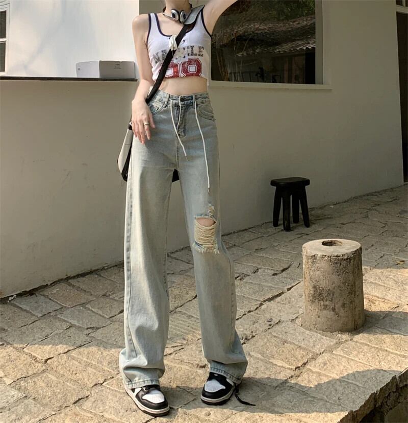 送料無料 Jielur ルーズスリムストレート女性のジーンズライト穴ダメージジーンズ女性ウエストデニムパンツ AE12188787829434244523