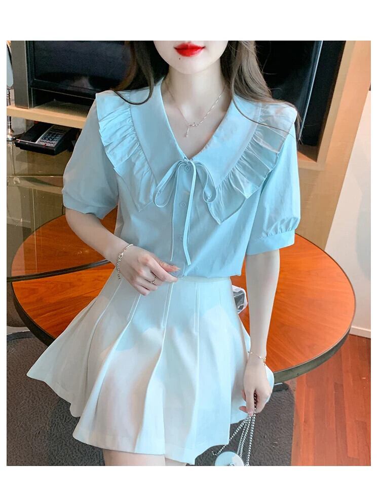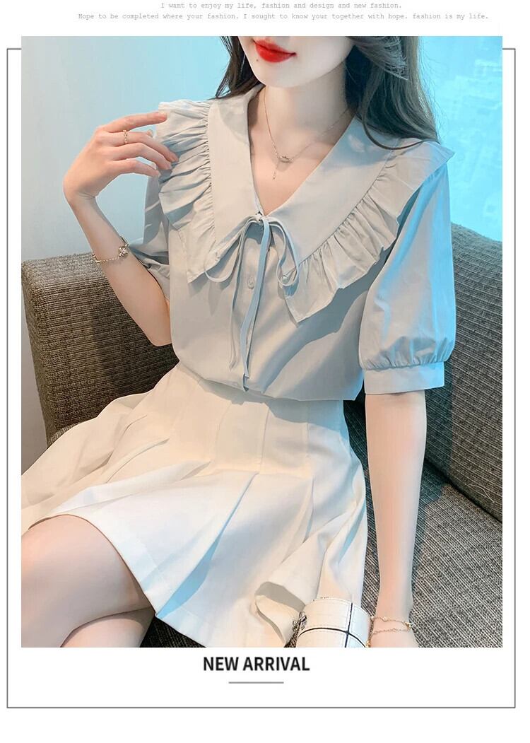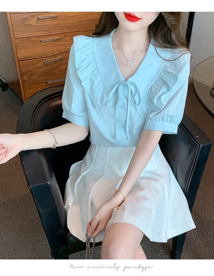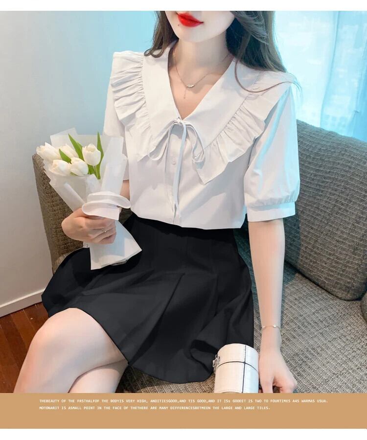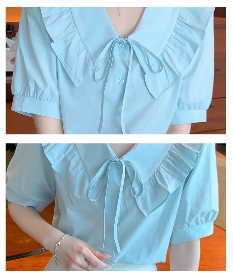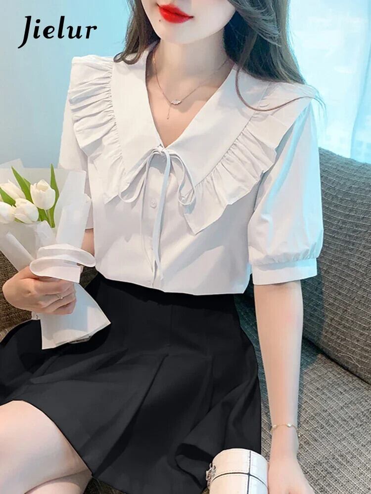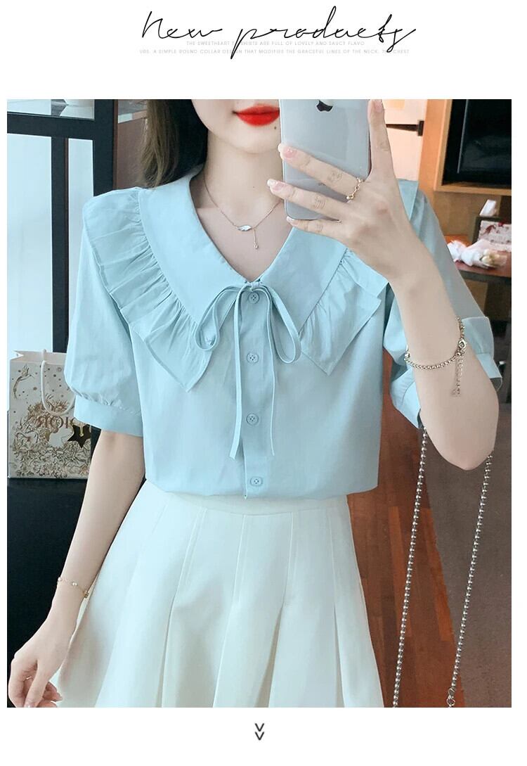 送料無料 Jielur 夏スリム女性シャツ甘いシャツ白青ルーズ V ネックフリルトップ女性 ホワイト ブルー 大人ガーリー スウィート キュート カジュアル サマー 夏物 Vネック AE1218878786200843302