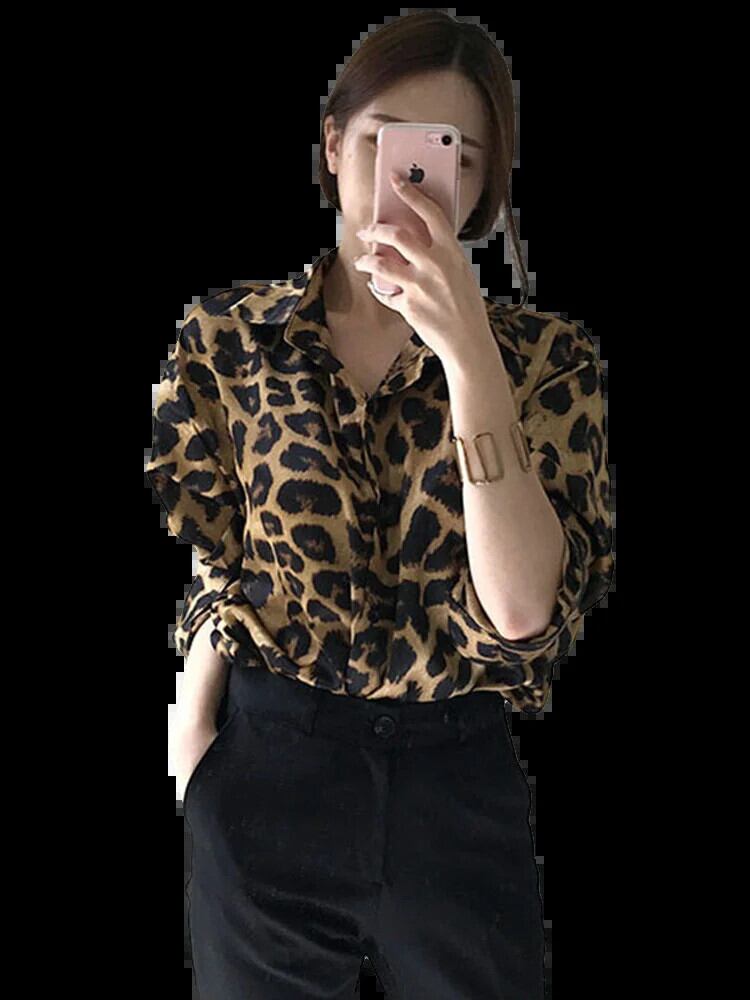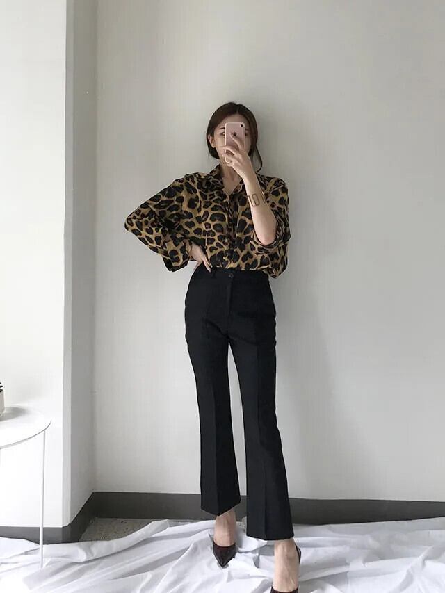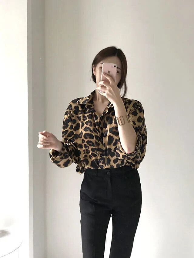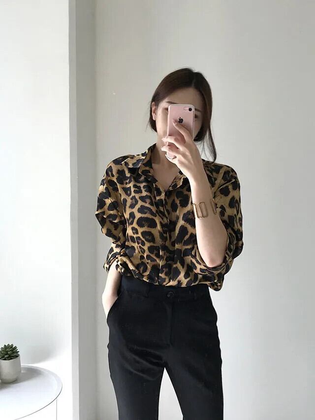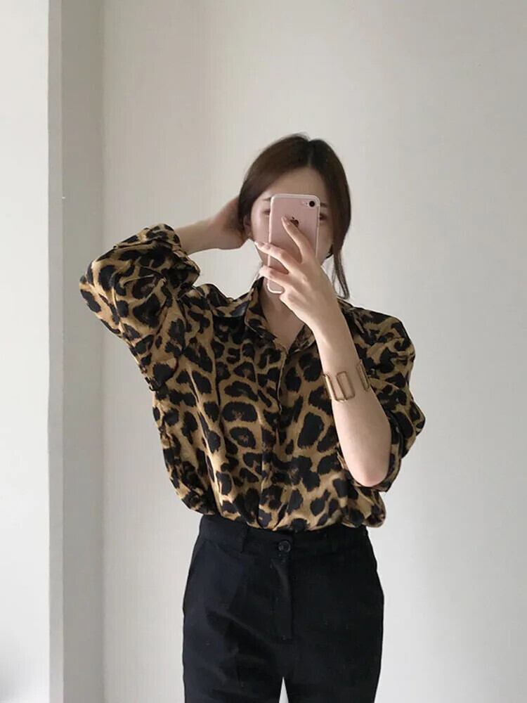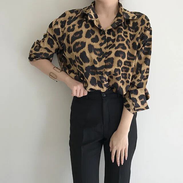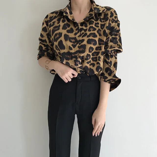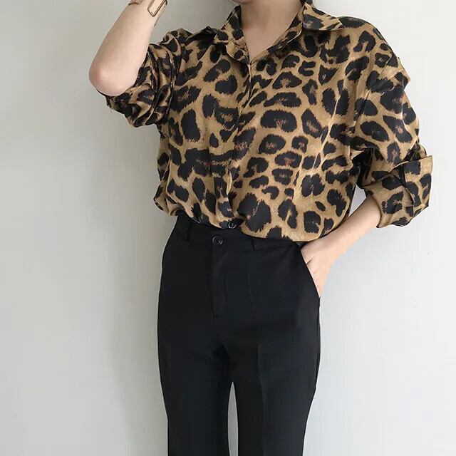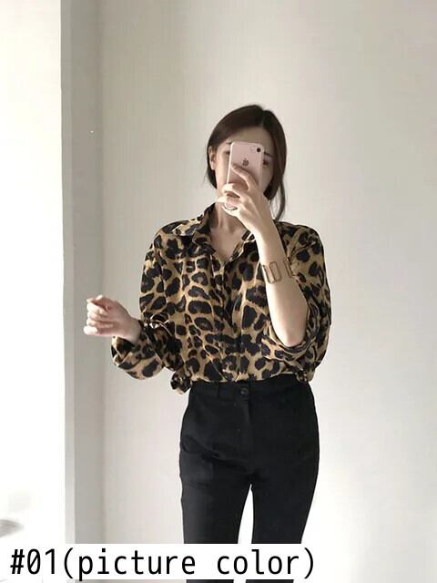 送料無料 Jielur シックなレトロヒョウ柄ルーズ長袖女性シャツストリートスリムトップベーシック女性シャツ ロング AE12188787819211454175