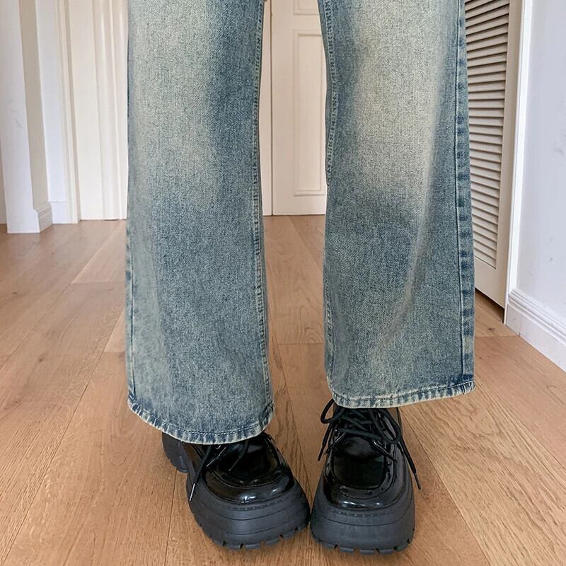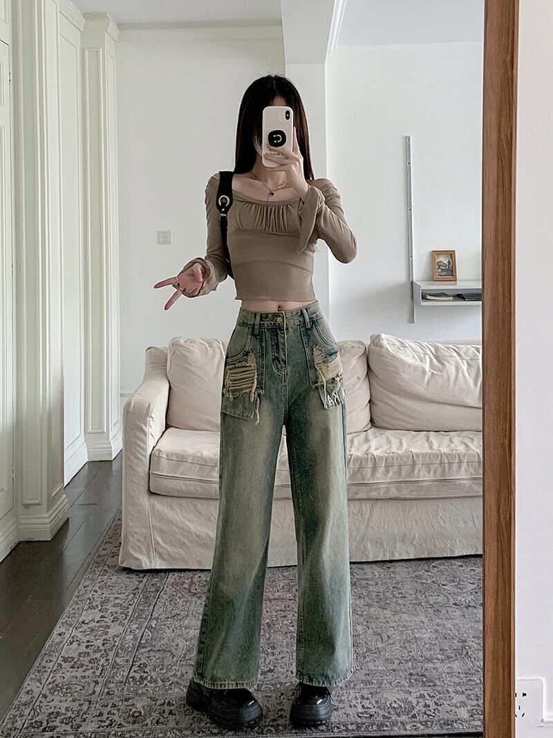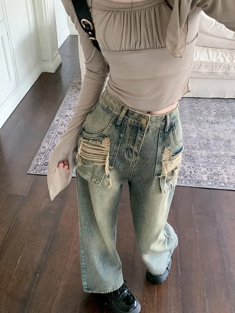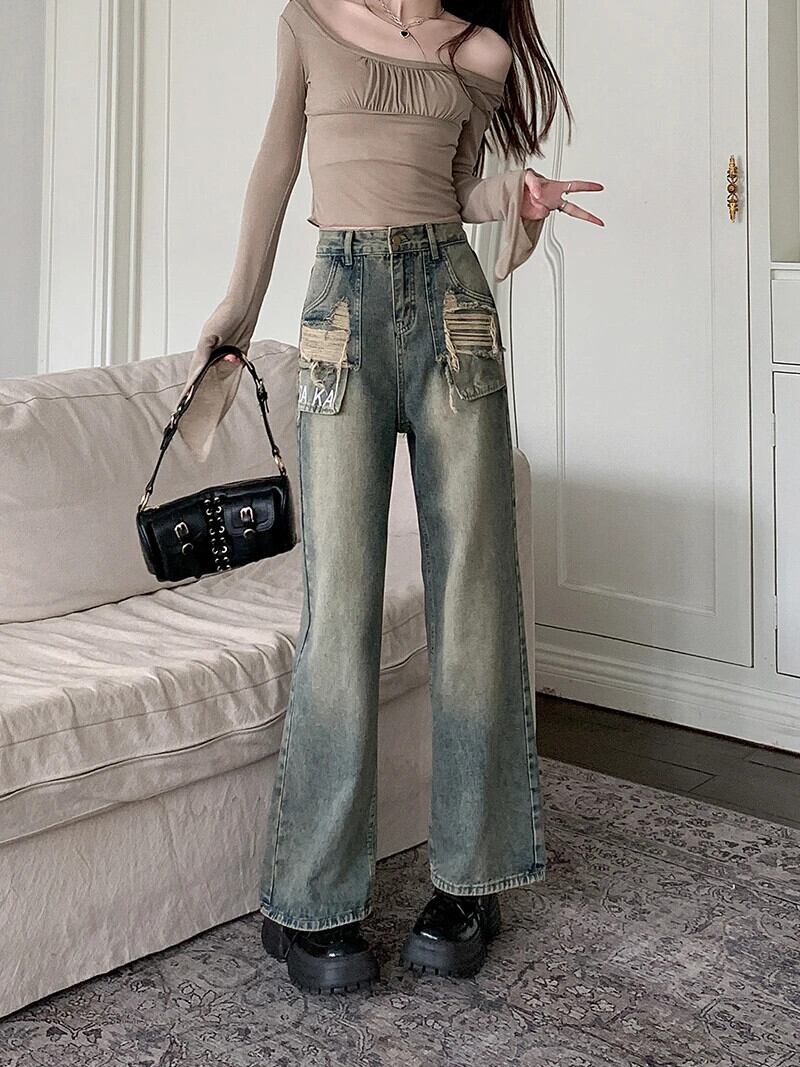 送料無料 Jielur Ins ヴィンテージ穴スリム女性ジーンズ秋ウエストルーズ Chicly 女性ジーンズワイドレッグパンツ オータム 秋物 ワイドパンツ ビンテージ AE12188787874856885982