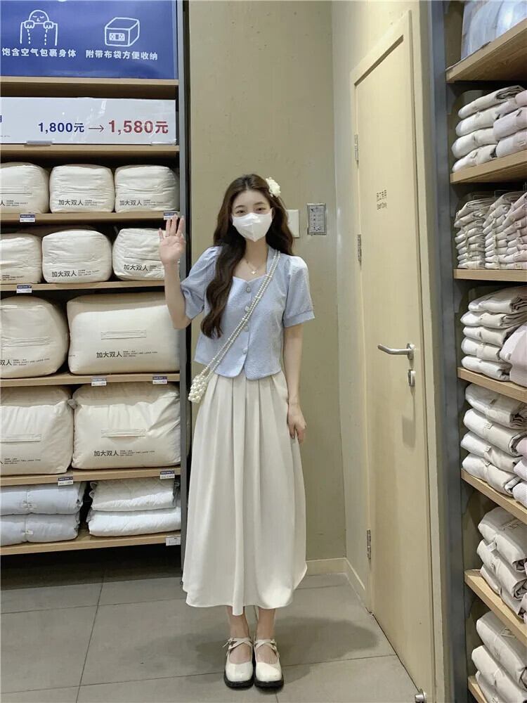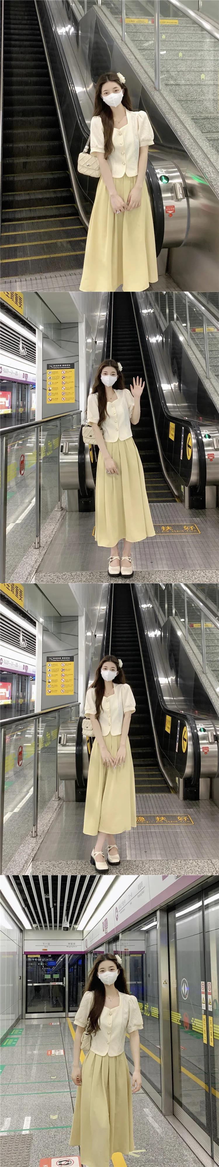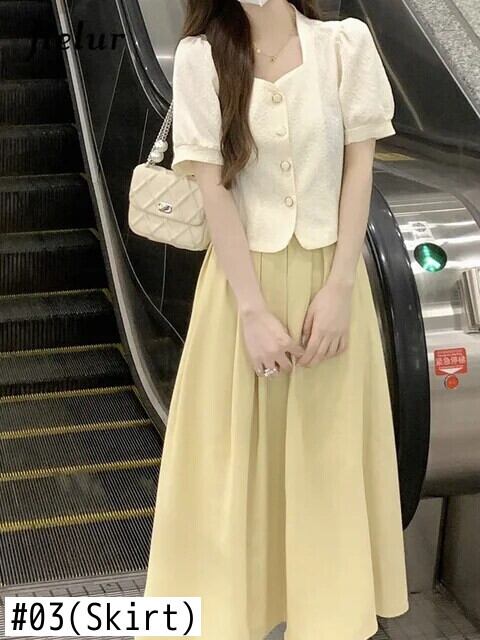 送料無料 Jielur ツーピース夏無地スリム女性シャツ甘いルーズパフスリーブシャツ女性ルーズアプリコットスカート 大人ガーリー スウィート キュート カジュアル サマー 夏物 ソリッドカラー AE12188787887465526693