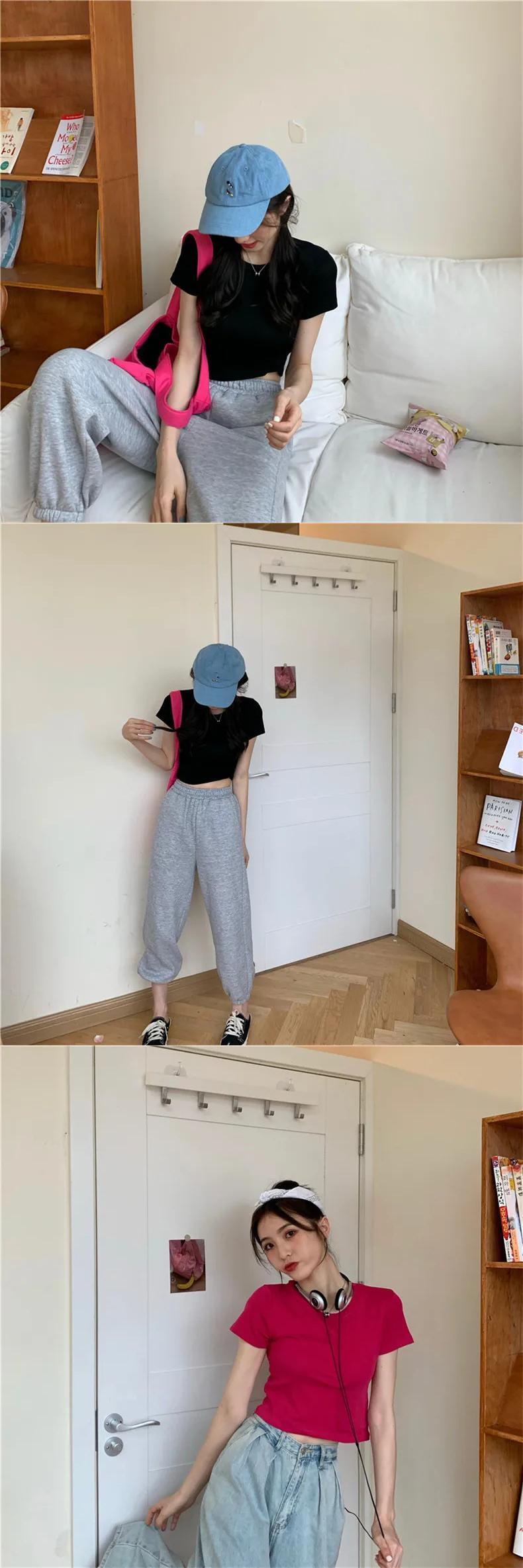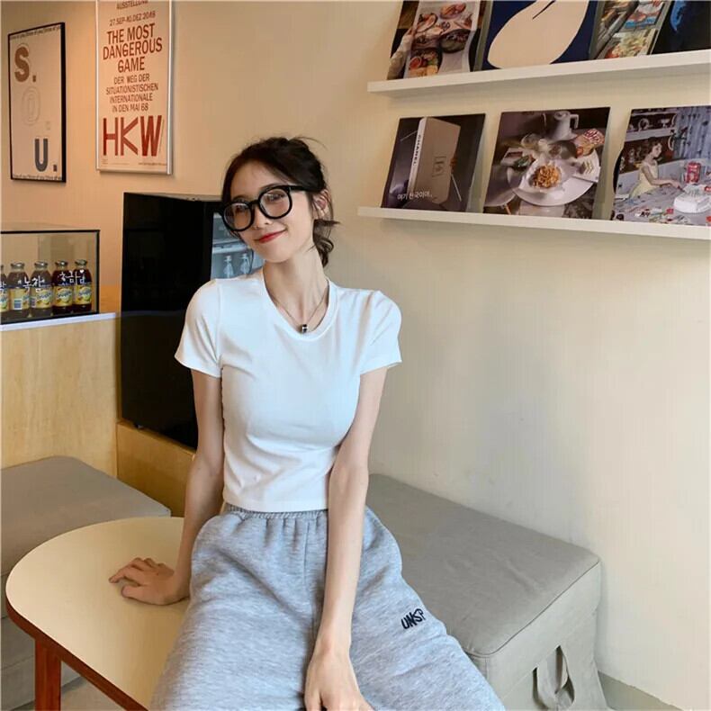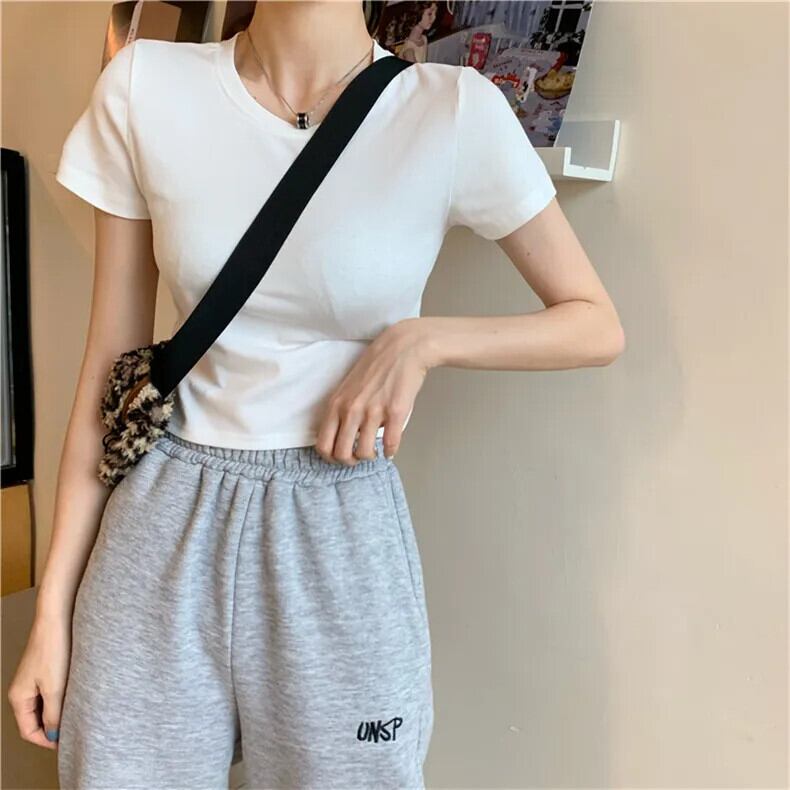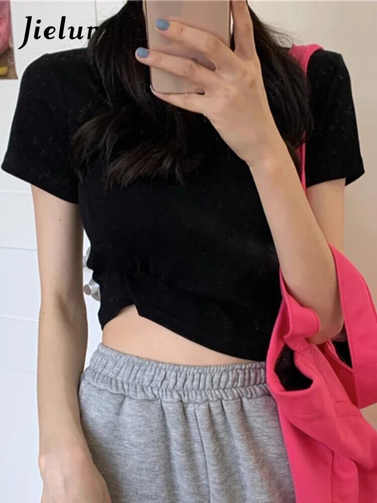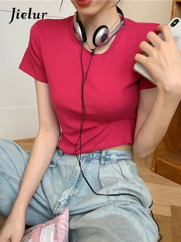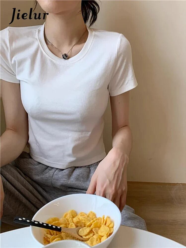 送料無料 Jielur 夏スリムソリッドカラーの女性の Tシャツインスリムウエスト Tシャツ女性白黒赤シンプルなベーシックトップ ホワイト レッド ブラック サマー 夏物 AE12188787878453661679