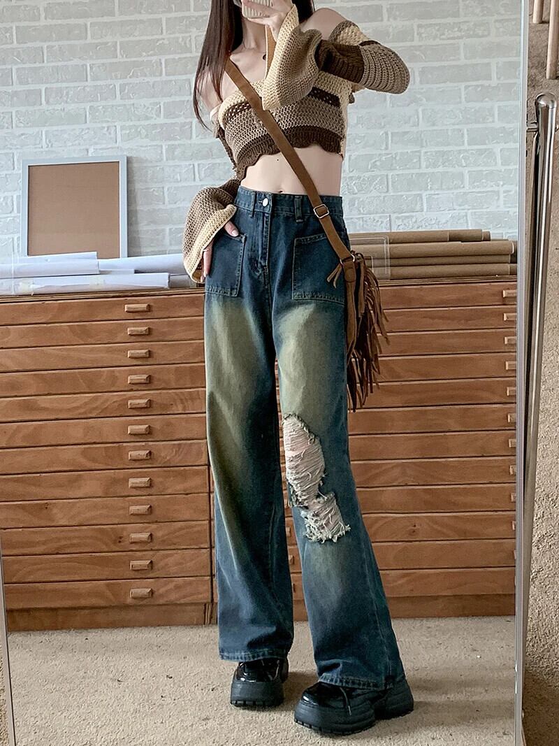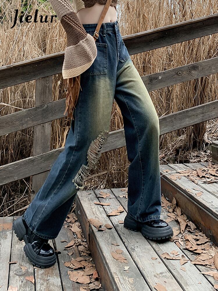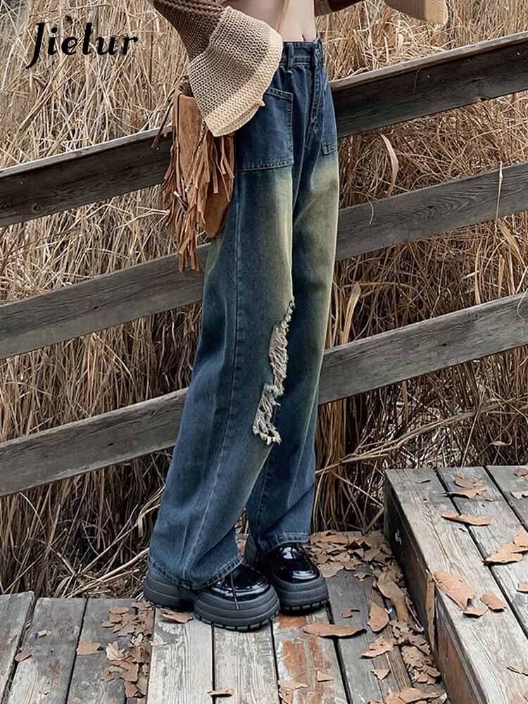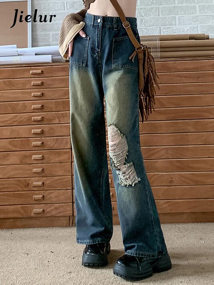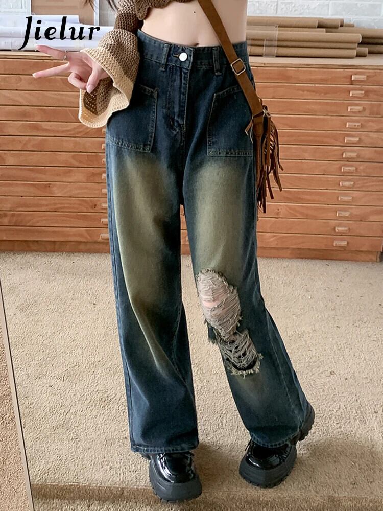 送料無料 Jielur アメリカンホットスイートシックな穴ヴィンテージジーンズ秋ルーズストレートウエストスリムシンプルな女性のジーンズ 大人ガーリー スウィート キュート カジュアル オータム 秋物 ビンテージ AE12188787817205969168