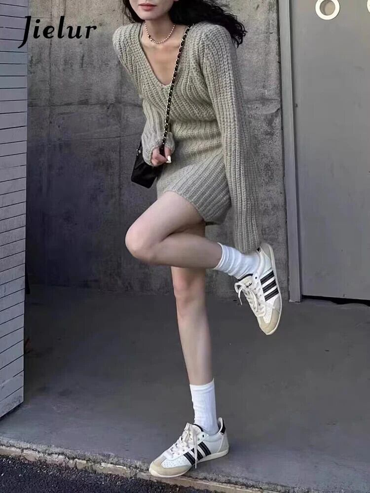 送料無料 Jielur 秋ソリッドカラースリムドレスプルオーバールーズニットプルオーバーグレーパープルスリムフィットストリートシックプルオーバー オータム 秋物 AE12188787816018336076