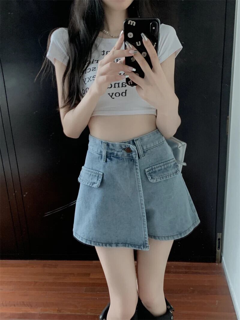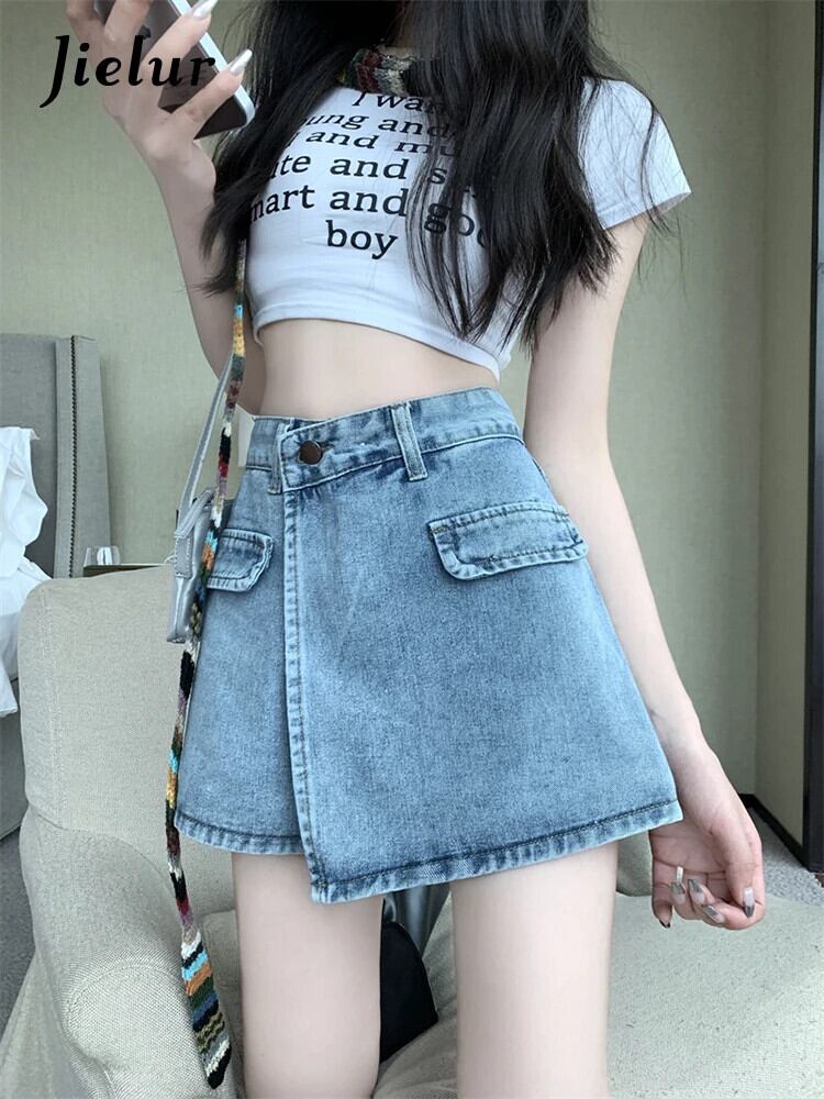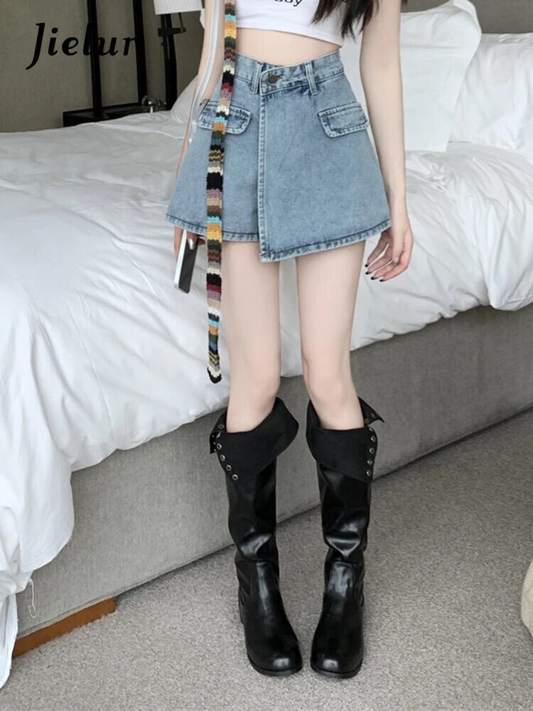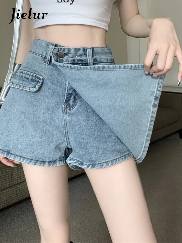 送料無料 Jielur アメリカンレトロ不規則なセクシーな女性のジーンズ夏のウエストスリム A ライン偽ツーピースショーツライト Bacis ジーンズ サマー 夏物 ブルマー Aライン AE12188787853836613760