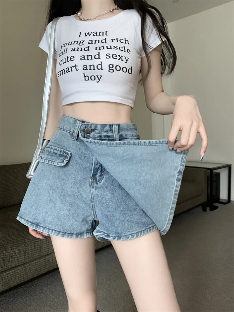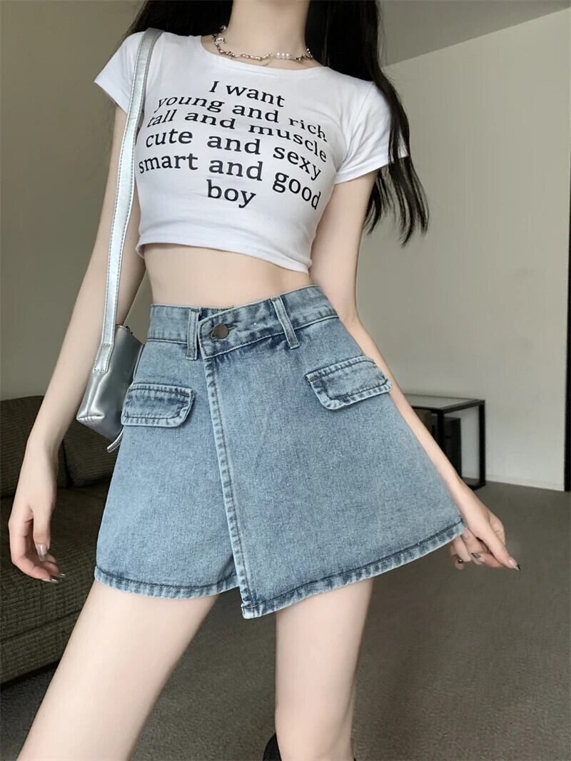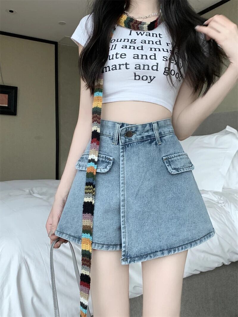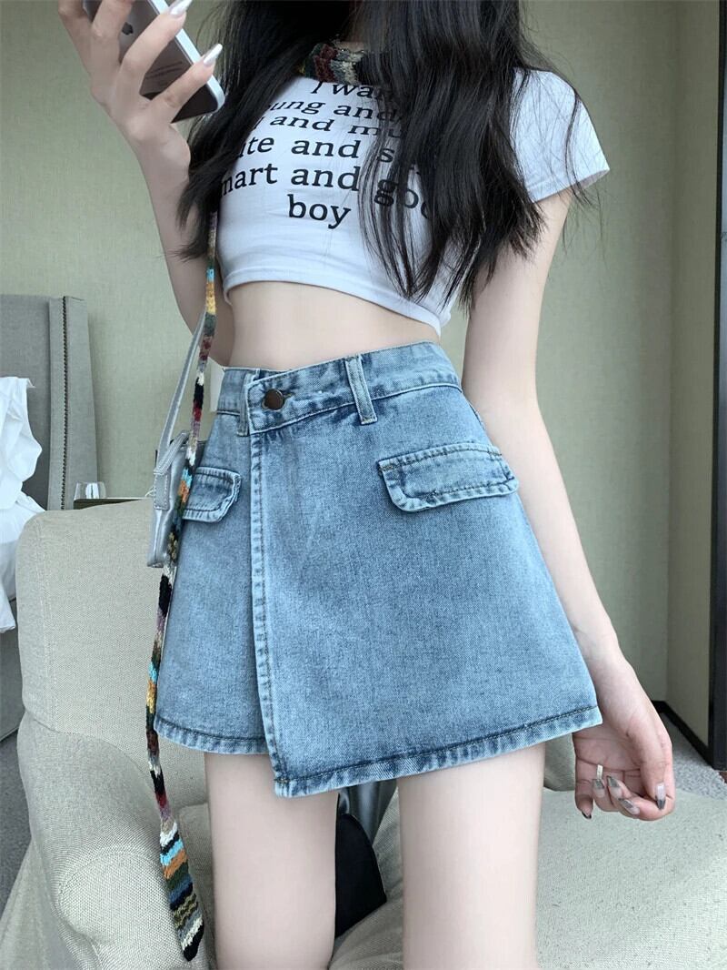 送料無料 Jielur アメリカンレトロ不規則なセクシーな女性のジーンズ夏のウエストスリム A ライン偽ツーピースショーツライト Bacis ジーンズ サマー 夏物 ブルマー Aライン AE12188787853836613760
