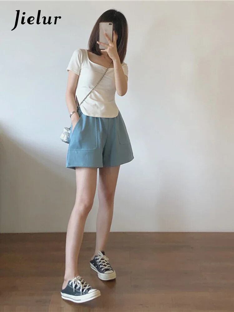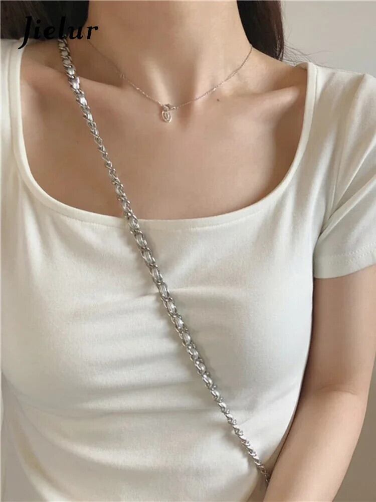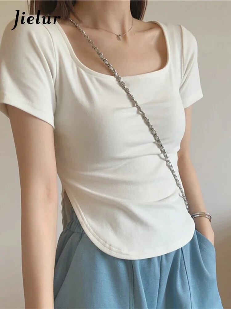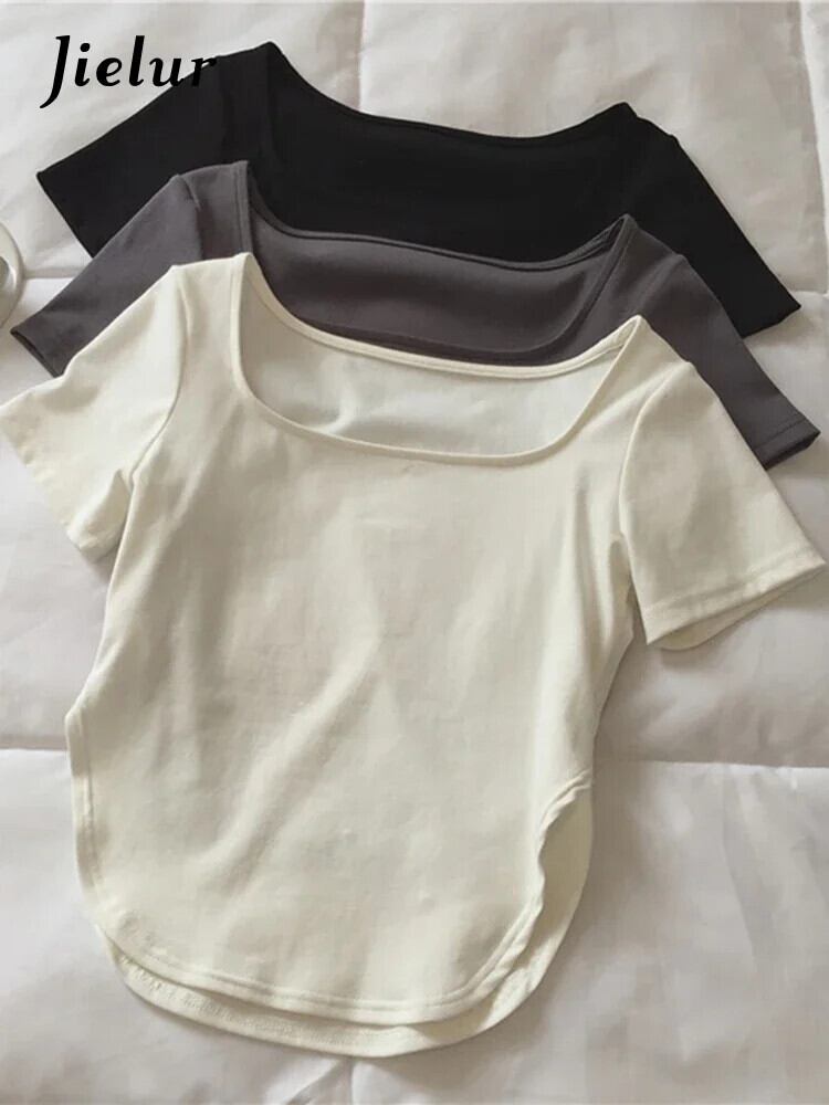 送料無料 Jielur 夏無地スリム女性の Tシャツシンプルなベーシックシックな Tシャツ女性白黒 O ネックトップ ホワイト ブラック サマー 夏物 Oネック ソリッドカラー AE1218878781502480422