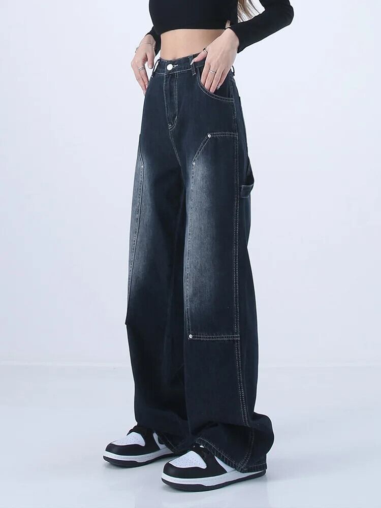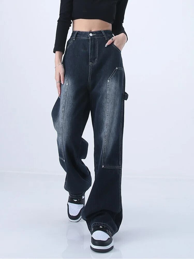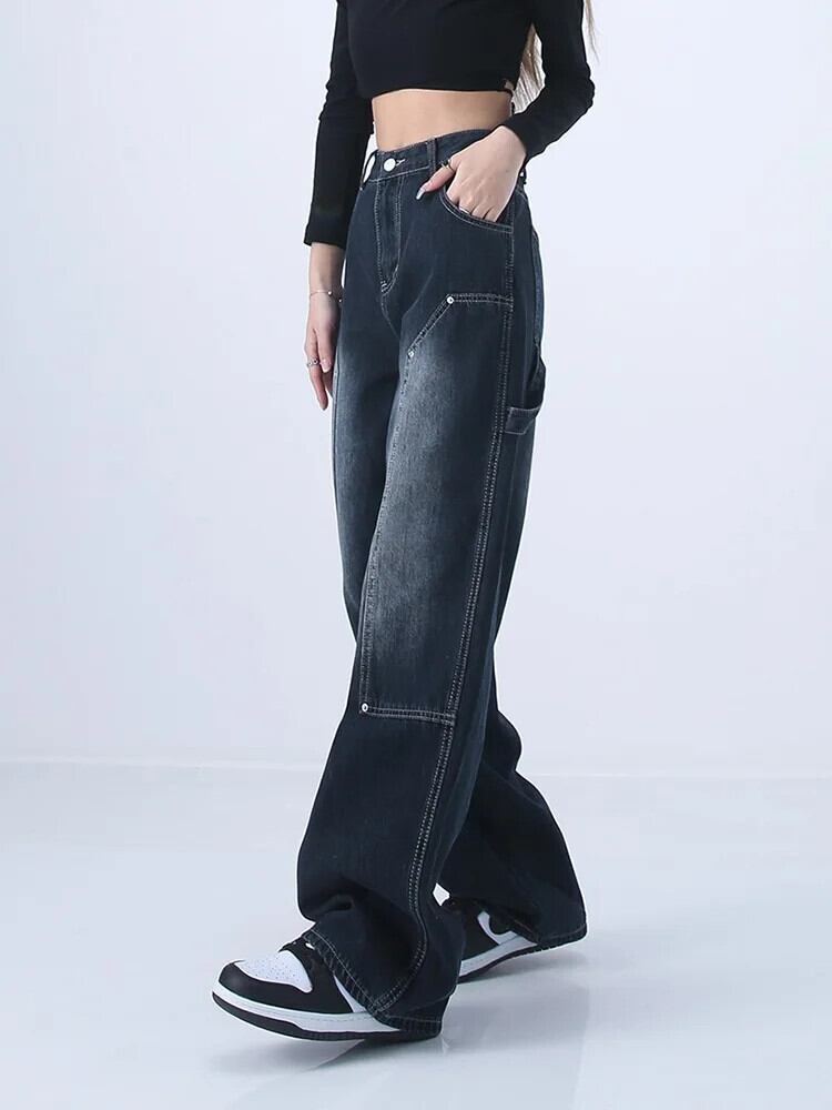 送料無料 Jielur ストリートだぶだぶのジーンズ女性春秋のウエストデニムパンツルーズパッチワークブラックグレージーンズ スプリング 春物 オータム 秋物 AE12188787853254002580