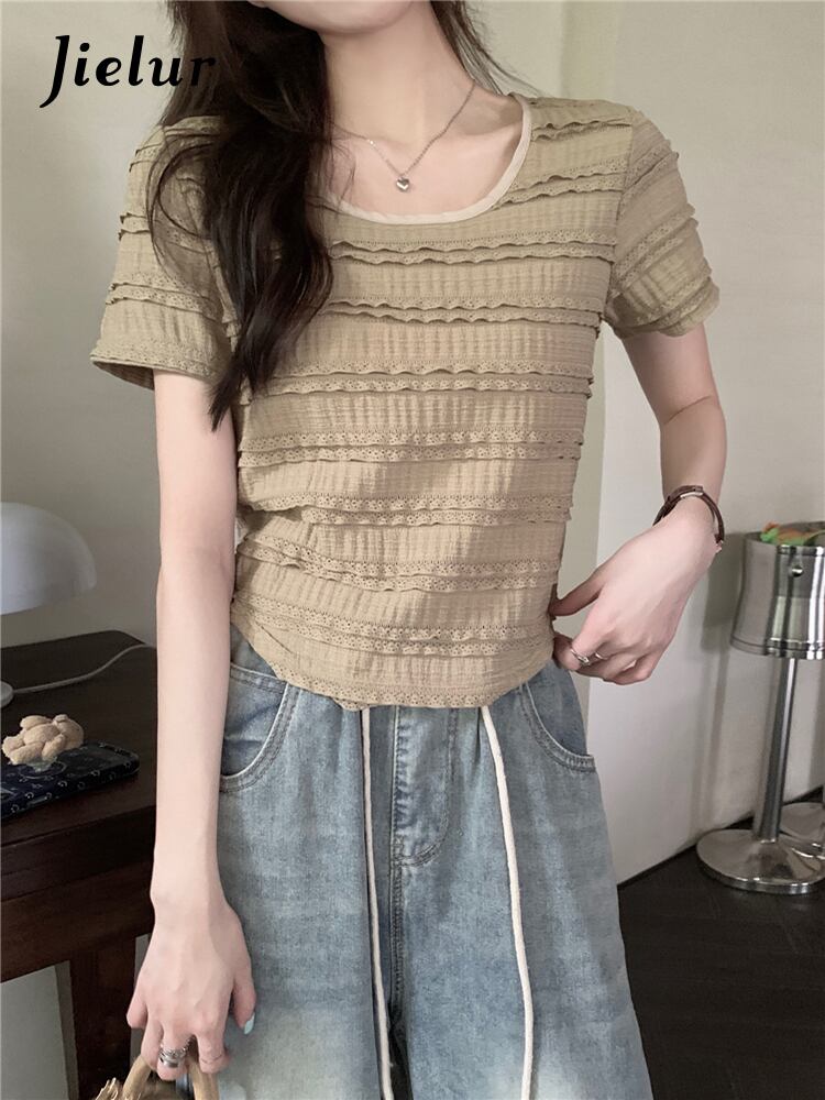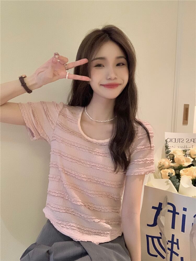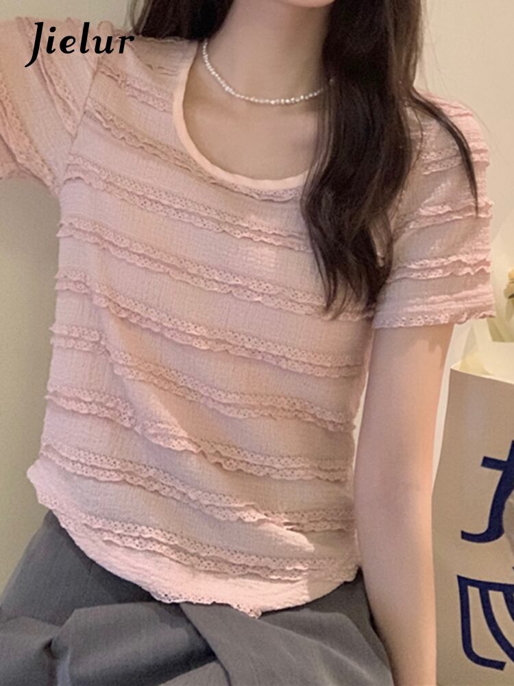 送料無料 Jielur 版ソリッドカラースリム女性ブラウス甘いブラウススクエアネックピンクカードニットトップ女性 大人ガーリー スウィート キュート カジュアル スクウェア AE12188787856719473379