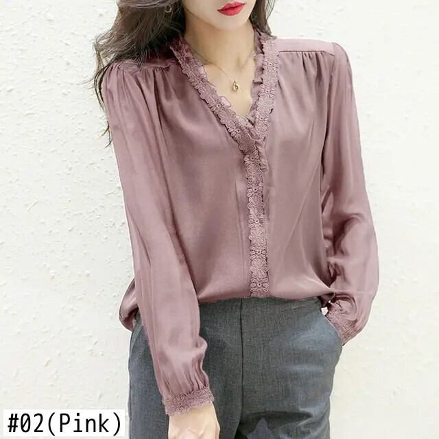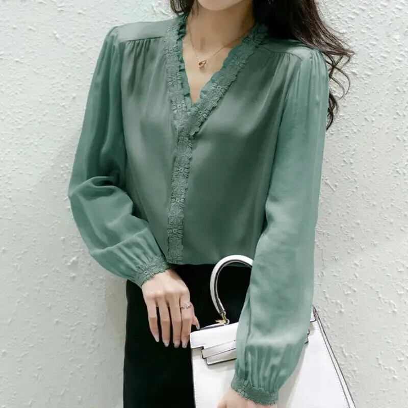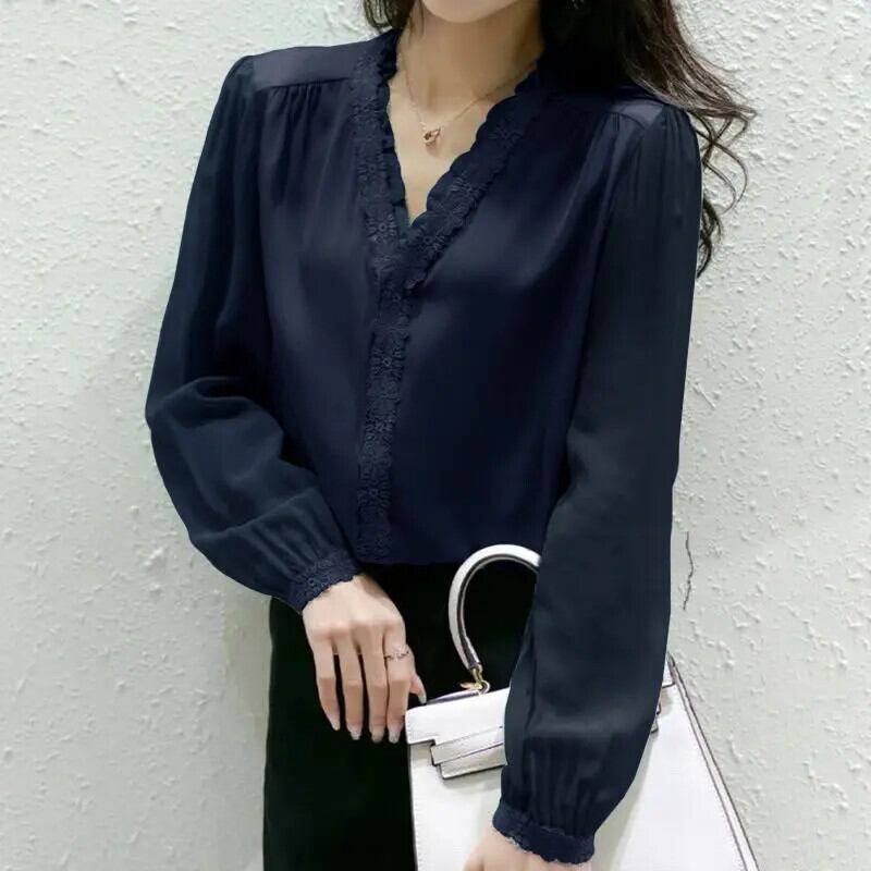 送料無料 フリルスプライスレース特大 V ネックシフォンシャツ 2022 夏と秋プルオーバー通勤女性のブラウス ラッフル サマー 夏物 オータム 秋物 Vネック AE1288776643602178448