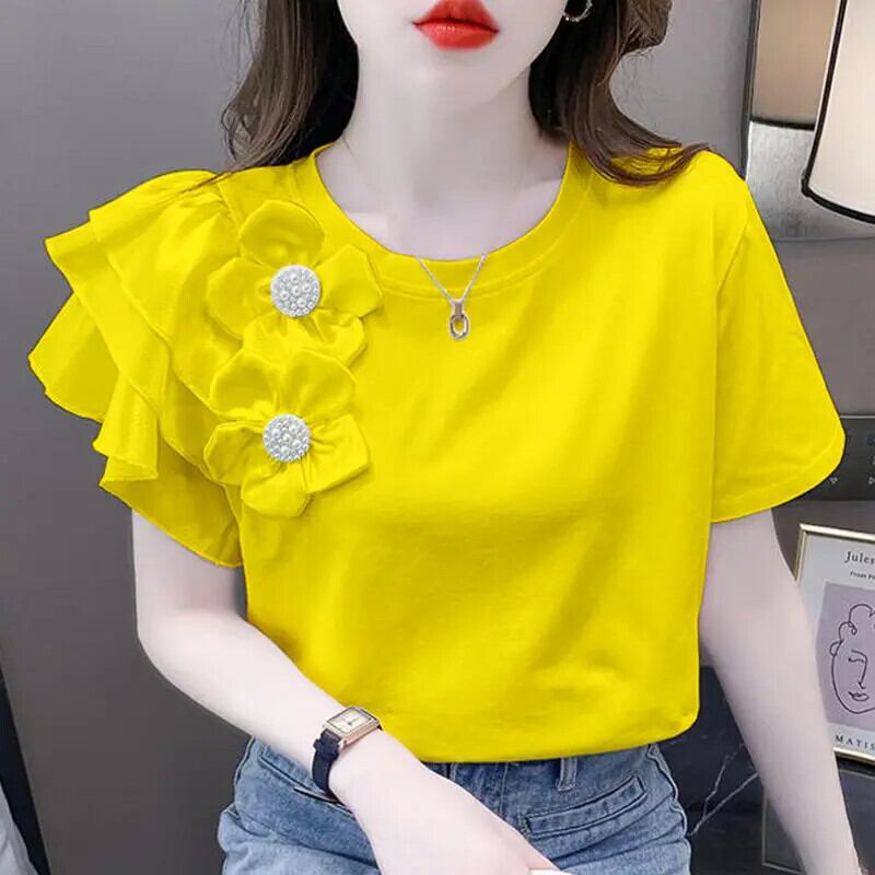 送料無料 O ネックスプライスビーズネクタイ花フリルブラウス女性の 2023 夏特大トップス甘いシャツ ラッフル 大人ガーリー スウィート キュート カジュアル サマー 夏物 Oネック フラワーデザイン AE1288776689653487923