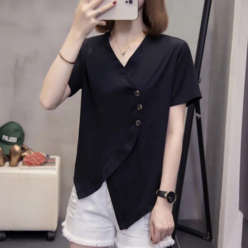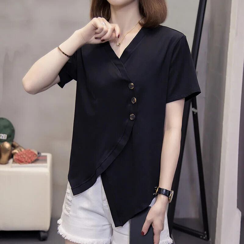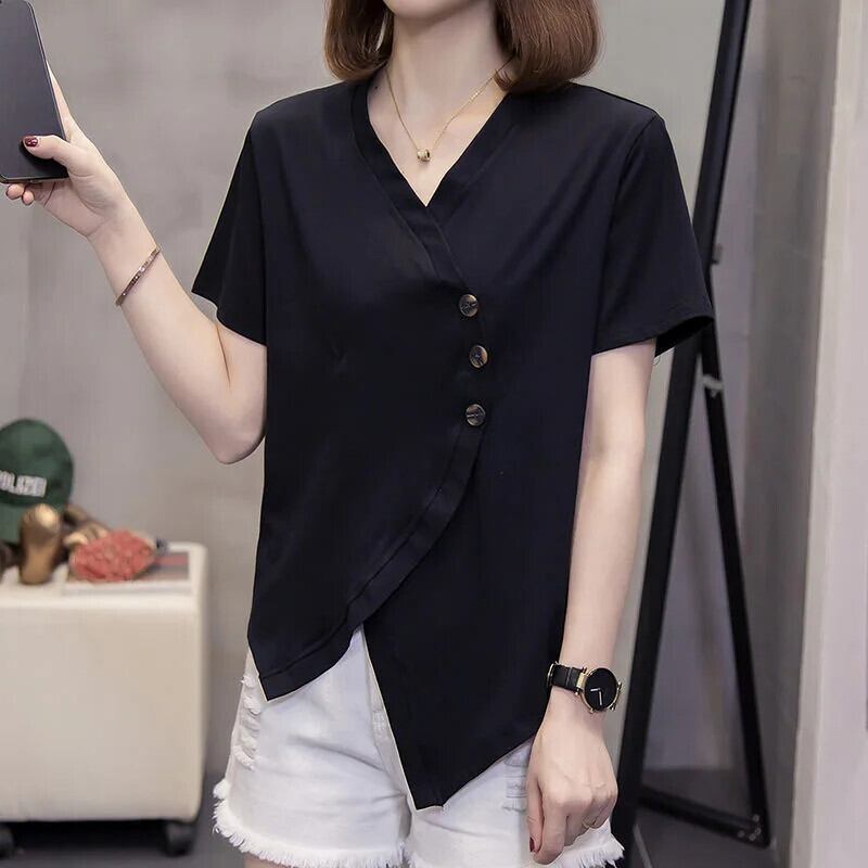 送料無料 スタイリッシュな V ネックボタンスプライシングルース非対称ブラウス女性の 2023 夏プルオーバートップス不規則なシャツ サマー 夏物 Vネック AE1288776684111171963