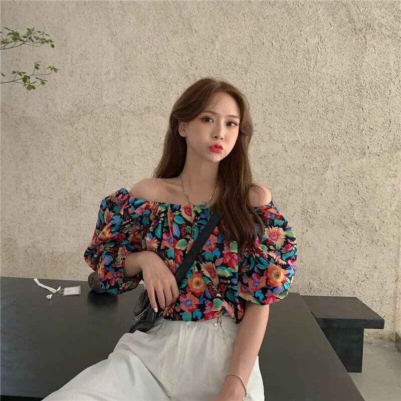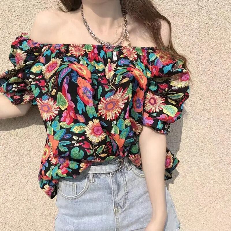 送料無料 スラッシュネックプリントセクシーなパフスリーブ Tシャツ女性の 2024 夏ルーズトップス甘い Tシャツ 大人ガーリー スウィート キュート カジュアル サマー 夏物 AE1288776610631317619