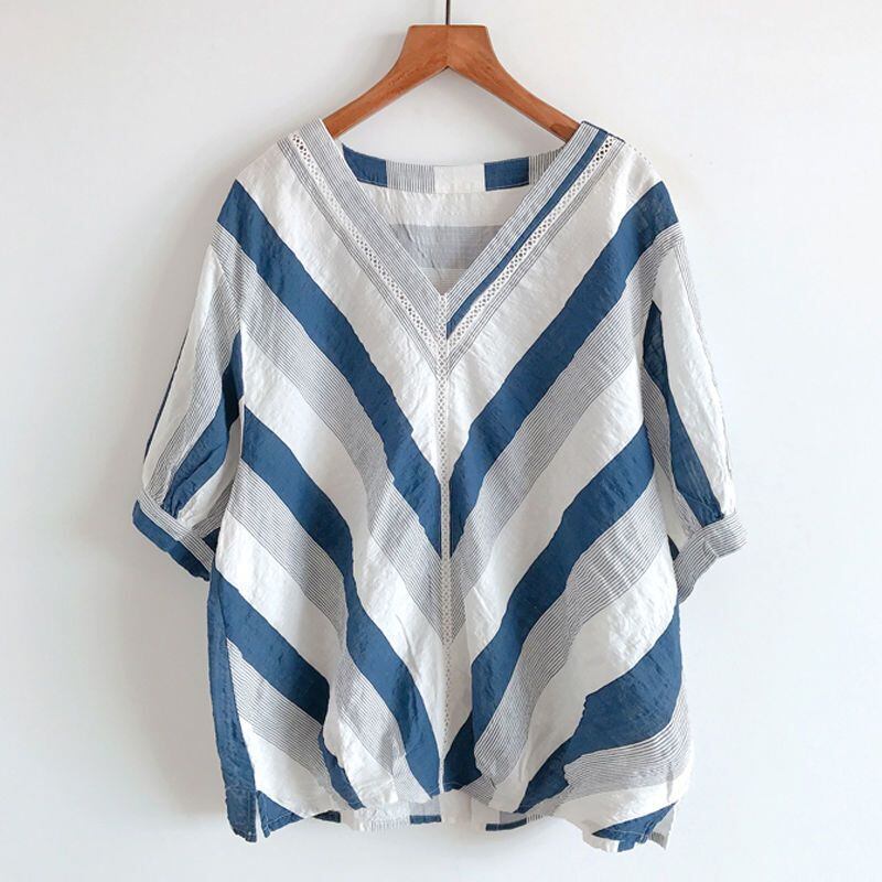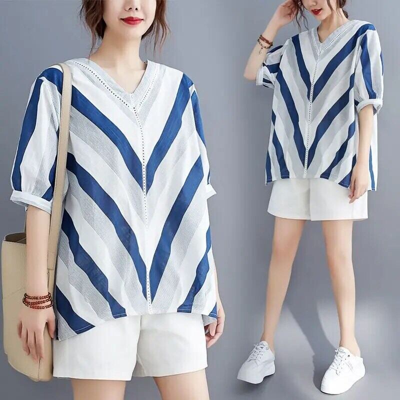送料無料 V ネックスプライスされた中空アウト非対称ストライプブラウス女性 2024 夏ルーズトップス通勤シャツ サマー 夏物 Vネック AE128877666059220134