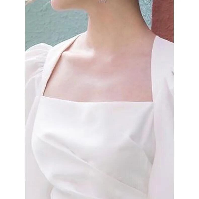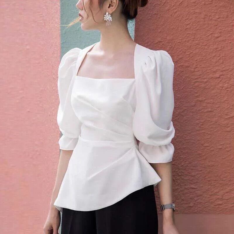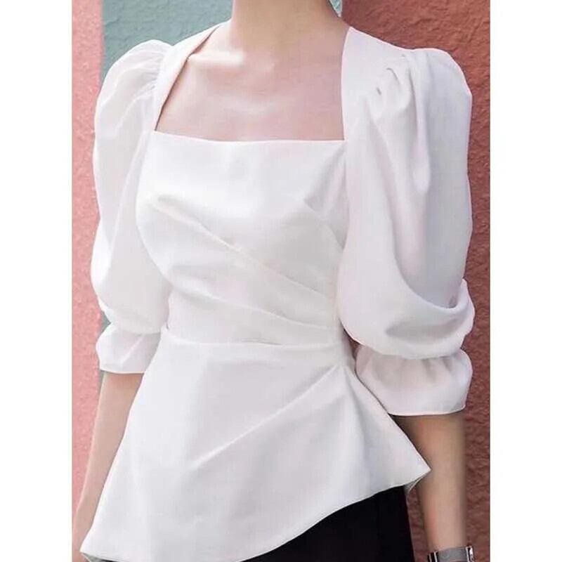 送料無料 スクエアカラーひだ非対称パフスリーブブラウス女性の 2024 夏ルーズトップス不規則なシャツ サマー 夏物 スクウェア AE128877666139856235