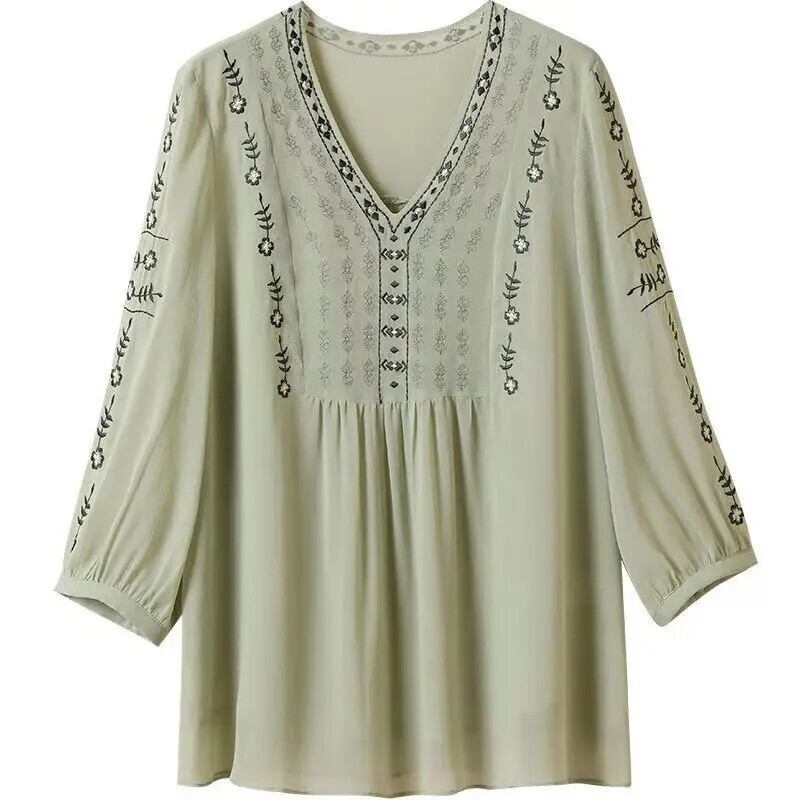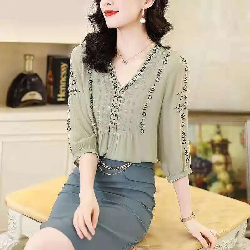 送料無料 Vネックひだスリークォーターシフォン刺繍ブラウス女性の2023夏プルオーバー通勤シャツ サマー 夏物 AE1288776662681372916