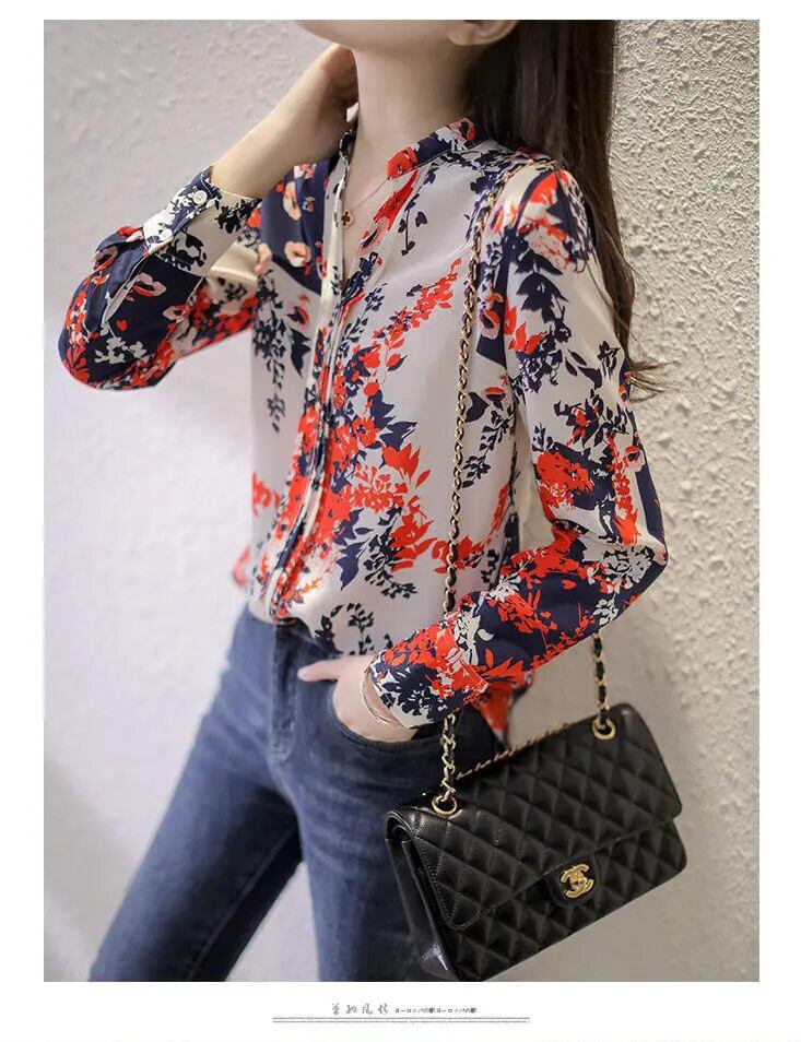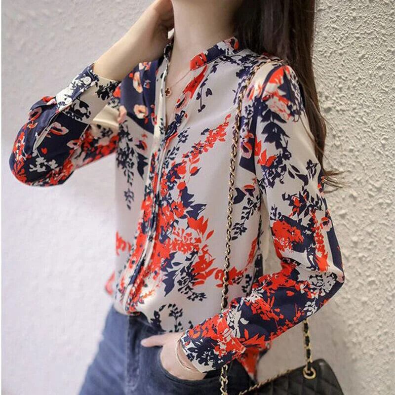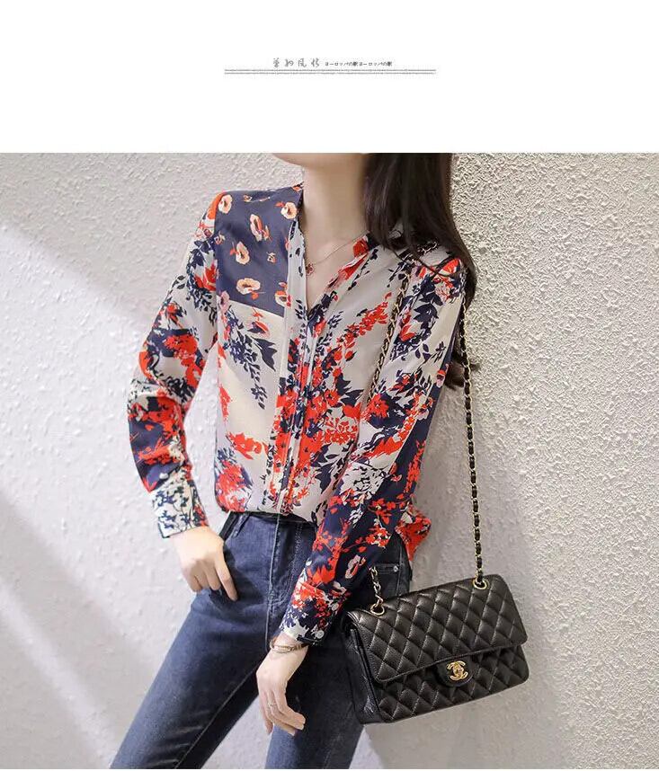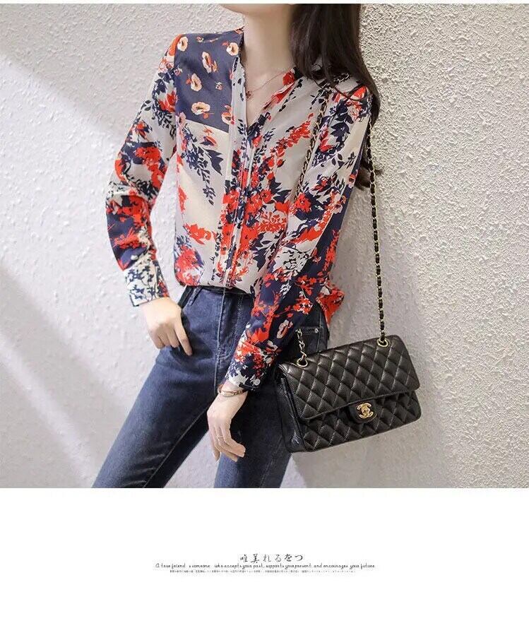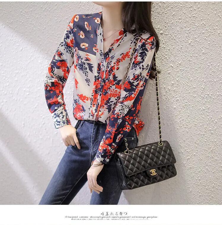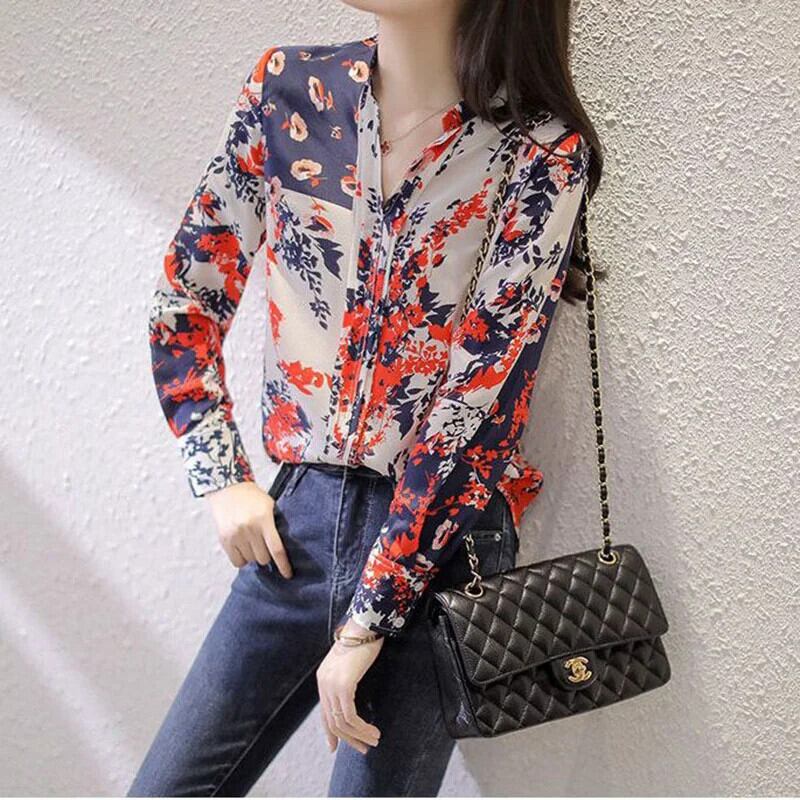 送料無料 ヴィンテージプリント V ネックシフォン花柄ブラウス女性の 2022 秋オールマッチプルオーバールーズオフィスレディシャツ オータム 秋物 Vネック ビンテージ 会社 学校 通勤や通学にも AE1288776637870627161