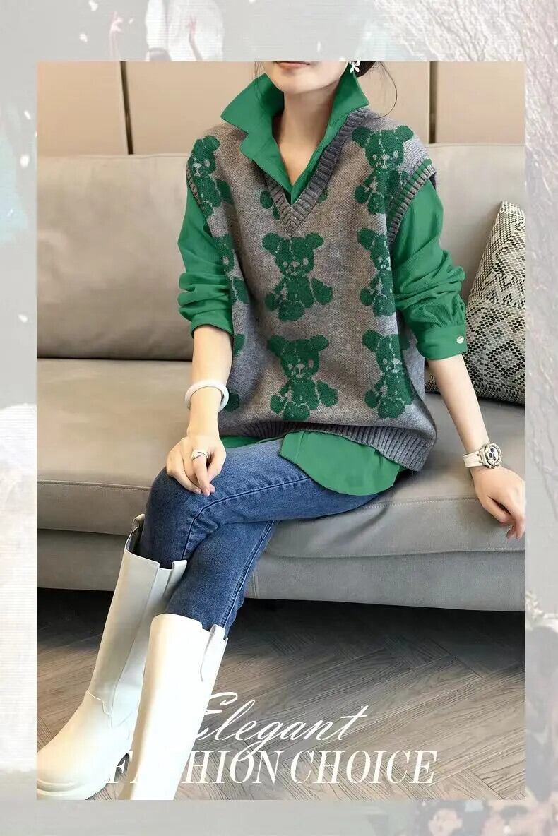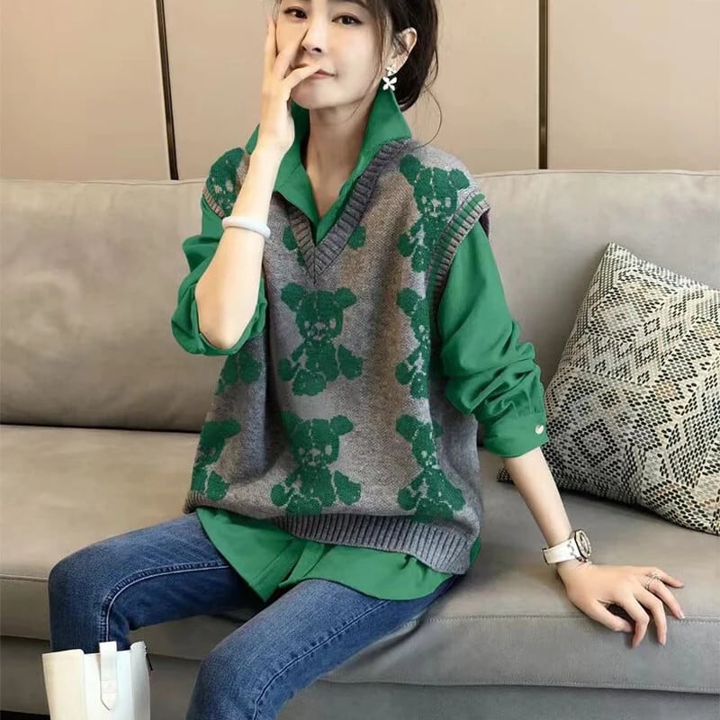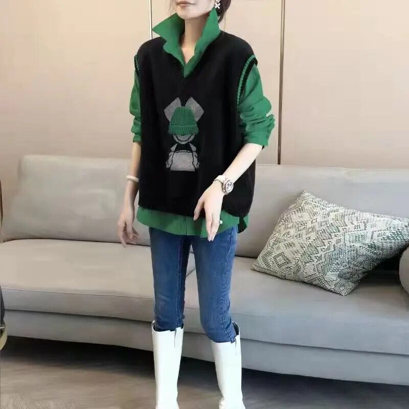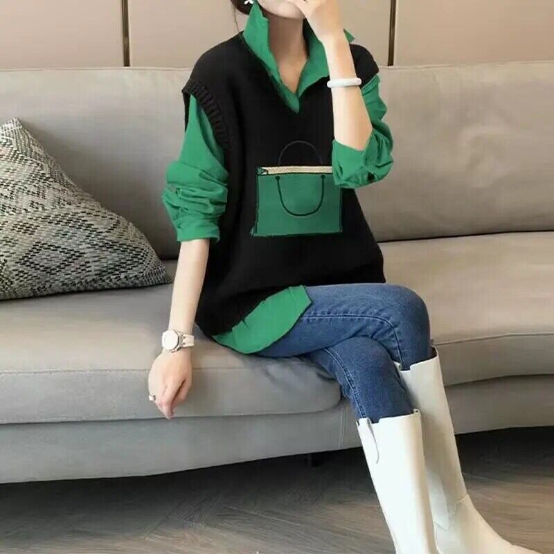 送料無料 ラペルスプライシングルーズ漫画シャツ女性の 2023 秋冬特大トップス通勤ブラウス オータム 秋物 ウィンター 冬物 AE1288776635941426674