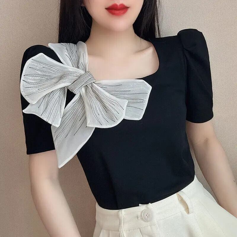 送料無料 スクエアカラースプライシングパフスリーブボウブラウス女性 2024 夏ルーズスウィート半袖トップスシャツ ショート リボン ハーフスリーブ 大人ガーリー キュート カジュアル サマー 夏物 スクウェア AE1288776677868664750
