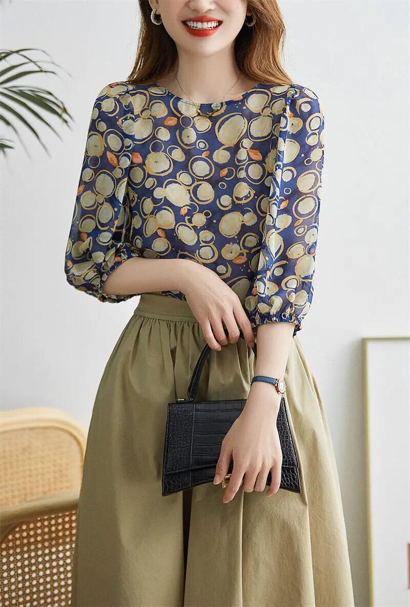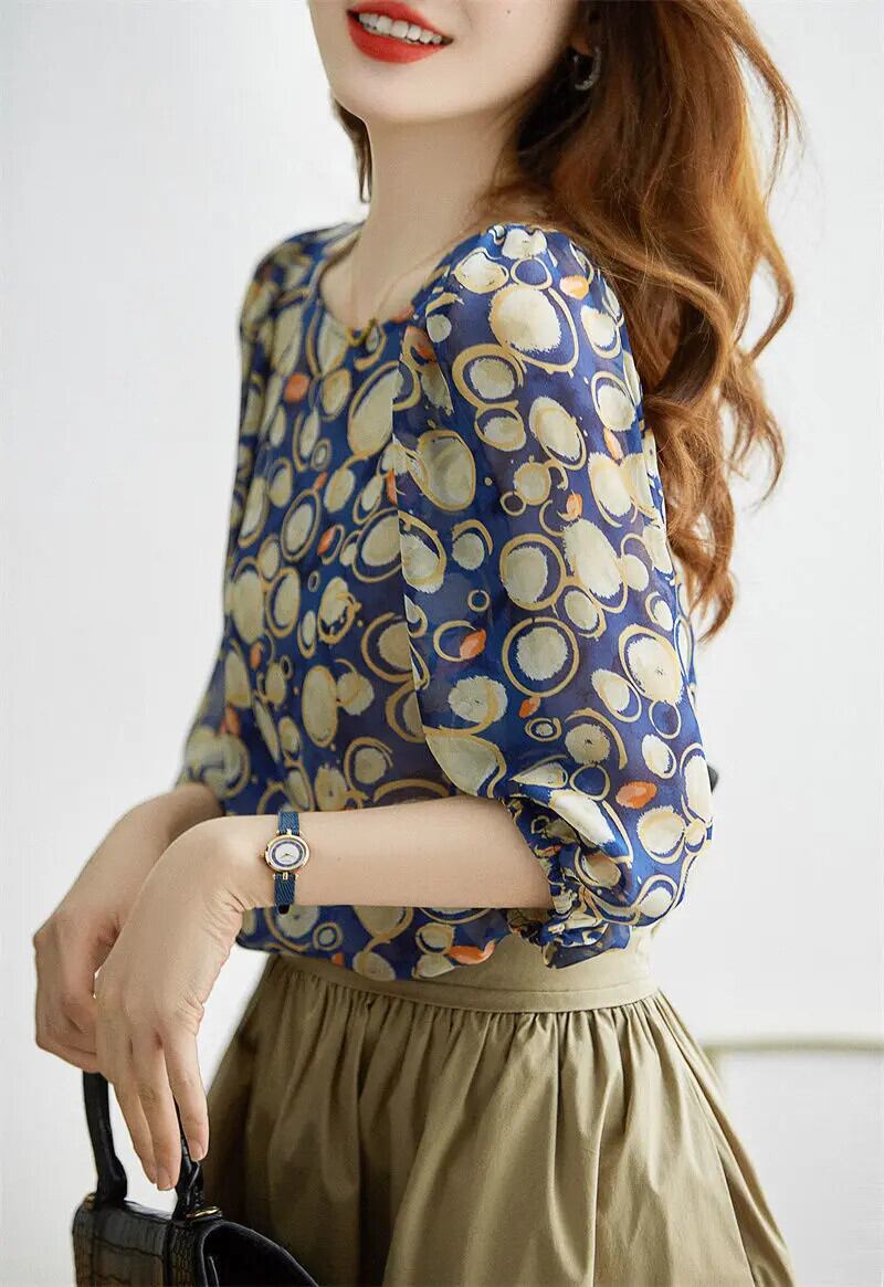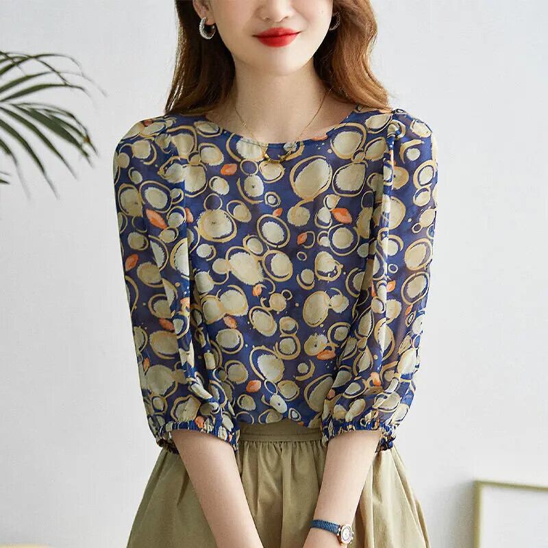 送料無料 ヴィンテージプリント O ネック 3/4 袖シャーリングルーズシフォンシャツ夏トップス特大通勤女性ブラウス 2022 サマー 夏物 Oネック ビンテージ AE1288776678152763259