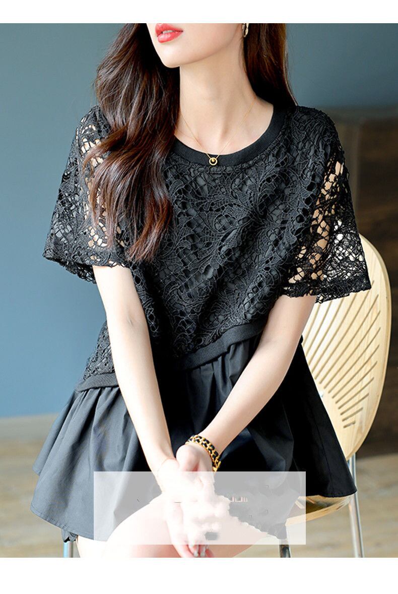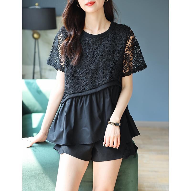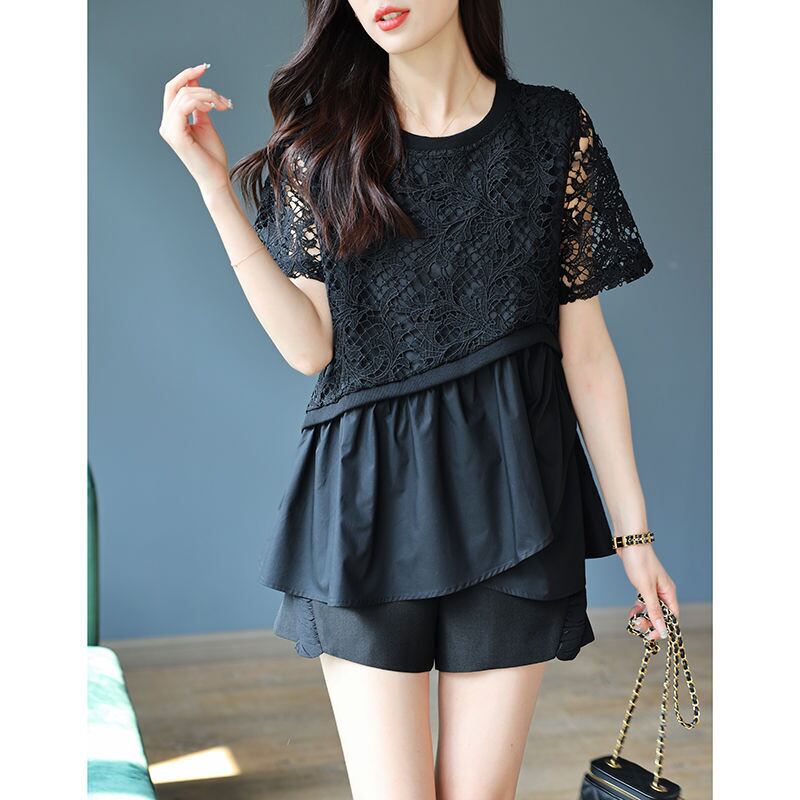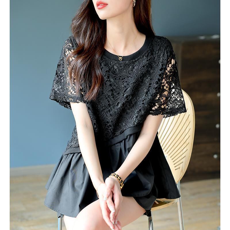 送料無料 スプライシングひだ非対称レース中空アウトブラウス女性の 2023 夏特大トップス通勤シャツ サマー 夏物 AE128877668471508545