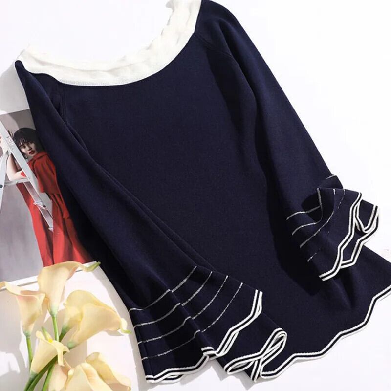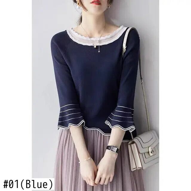 送料無料 スタイリッシュなルーズニットスプライシングガーゼフリルフレアスリーブブラウス女性の 2023 春プルオーバー通勤シャツ ラッフル スプリング 春物 AE1288776627820597044