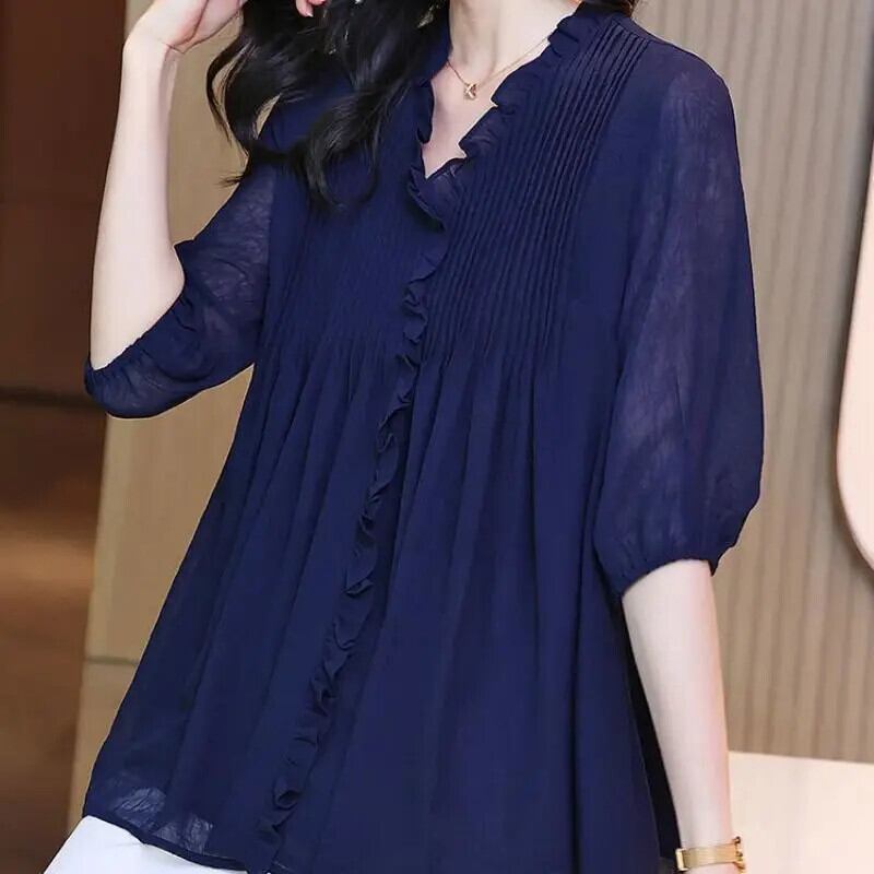 送料無料 ソリッドカラーのスプライス折り目フリルシフォンブラウス女性の 2023 春特大プルオーバーシックなシャツ ラッフル スプリング 春物 AE1288776660431175975
