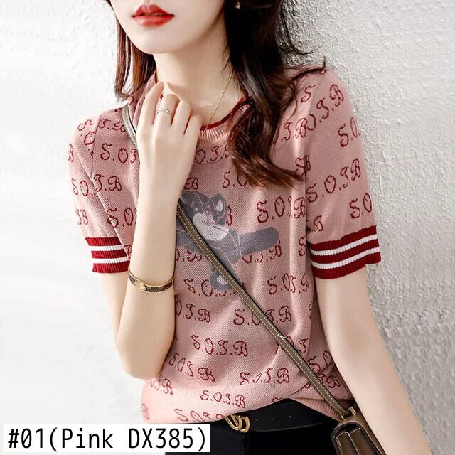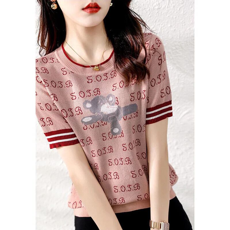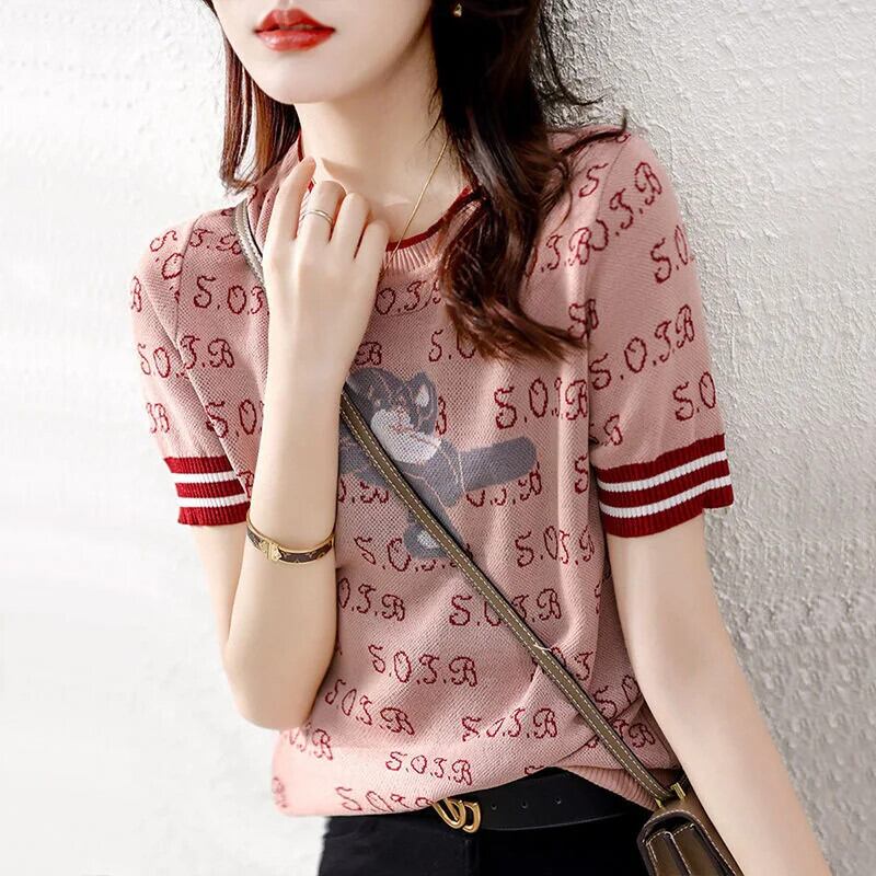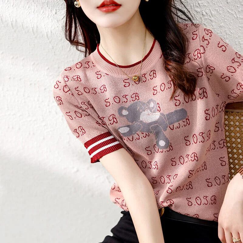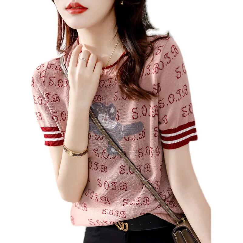 送料無料 ヴィンテージプリント O ネックニットスプライシングオールマッチブラウス 2023 夏プルオーバールーズ通勤シャツ サマー 夏物 Oネック ビンテージ AE1288776638340431956
