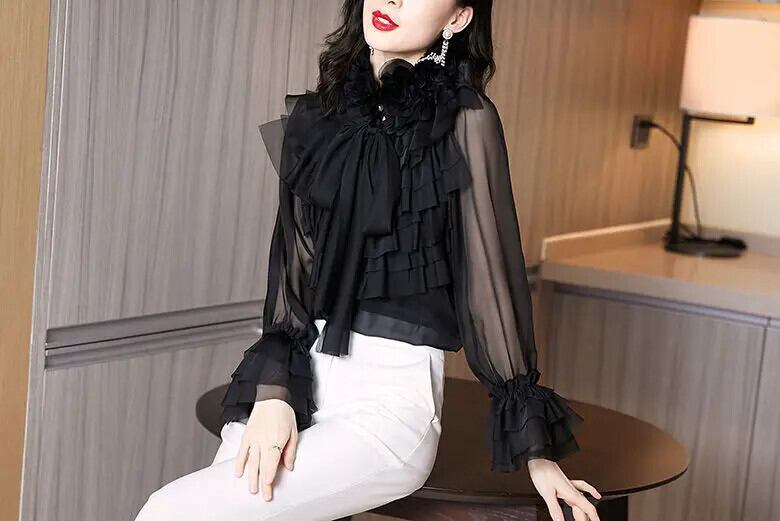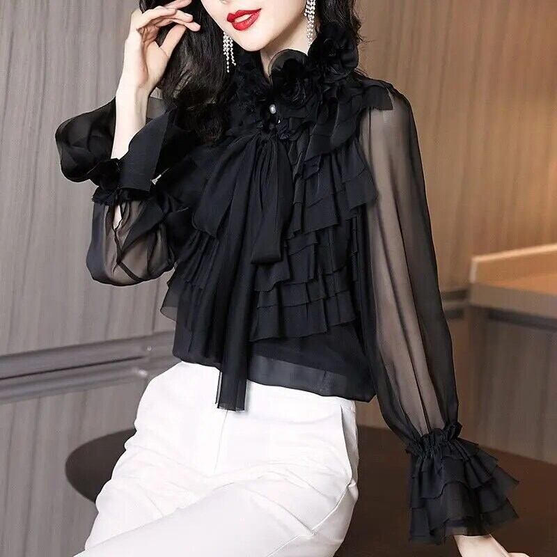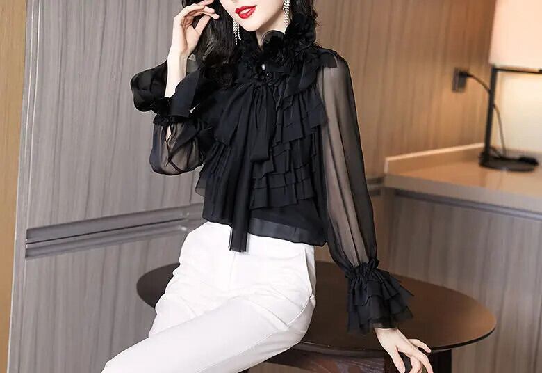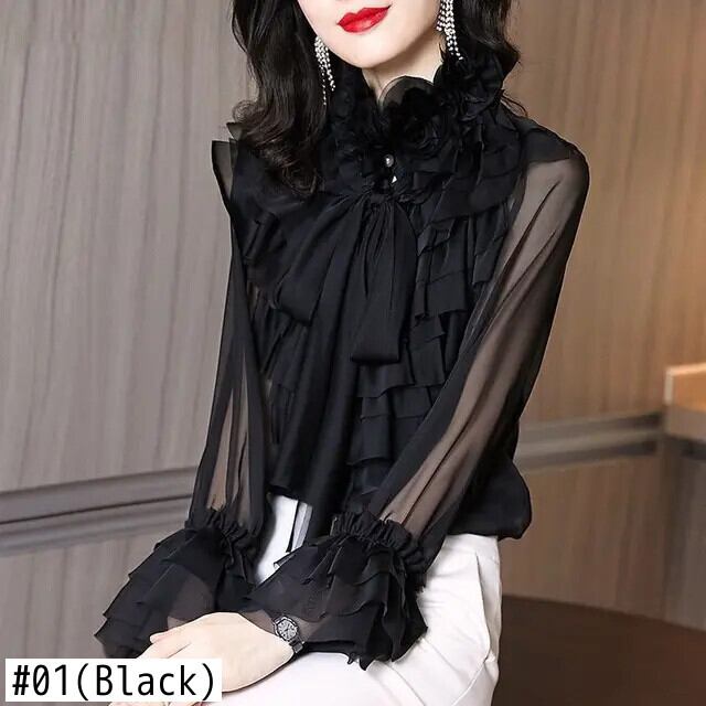 送料無料 リボン花びら袖ガーゼシャツ レディース 2022 春 オフィスレディ 通勤 フリルネック ブラウス スプリング 春物 会社 学校 通勤や通学にも AE1288776689910253827