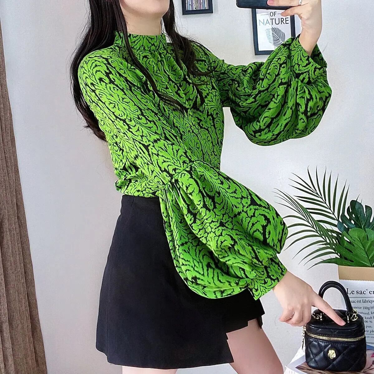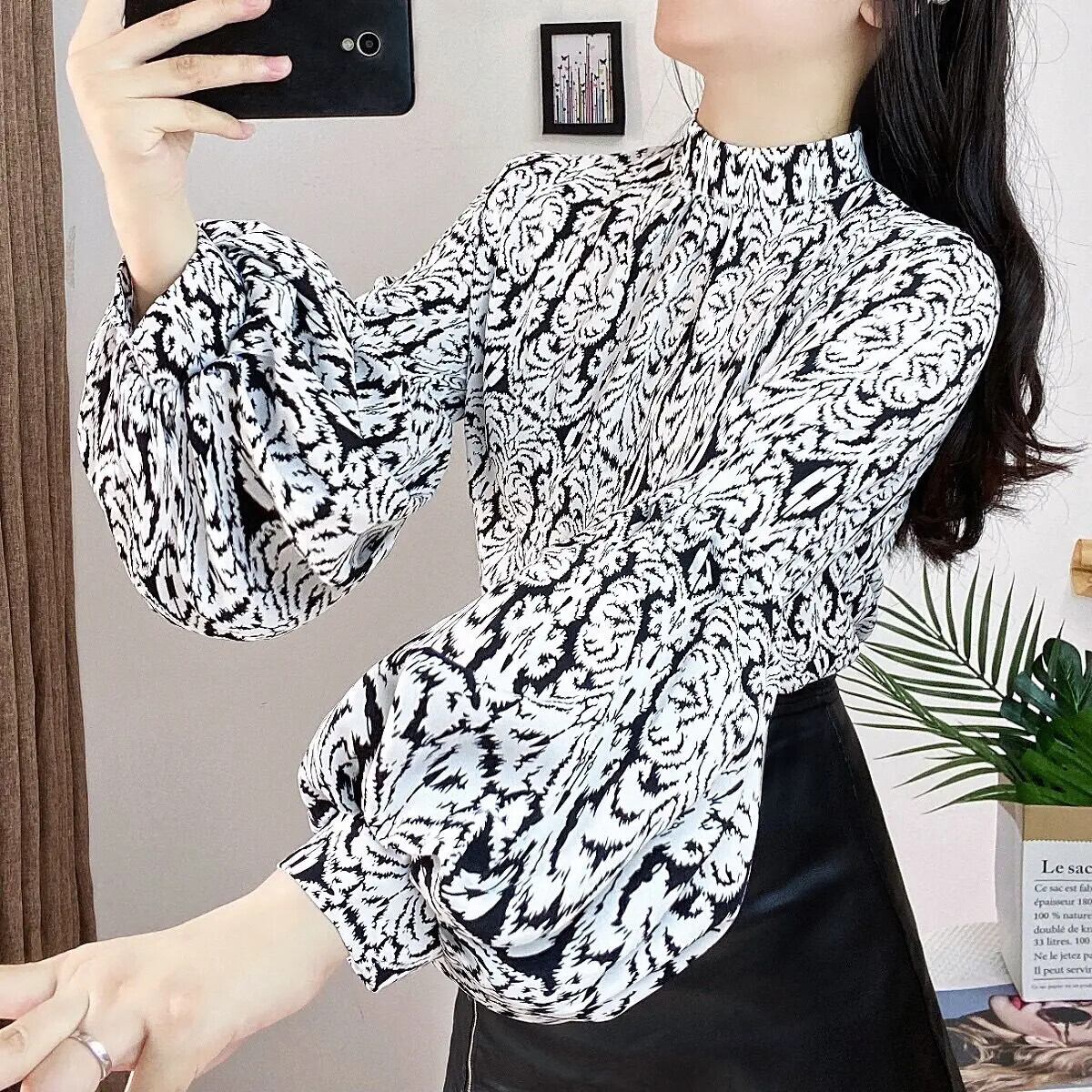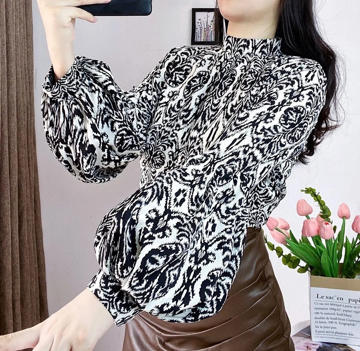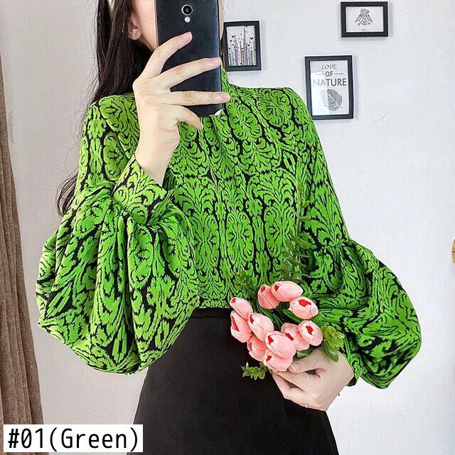 送料無料 ヴィンテージプリントスタンドカラーランタンスリーブブラウス女性 2023 秋冬ルーズプルオーバーオフィスレディシャツ オータム 秋物 ウィンター 冬物 ビンテージ 会社 学校 通勤や通学にも AE1288776622521884502