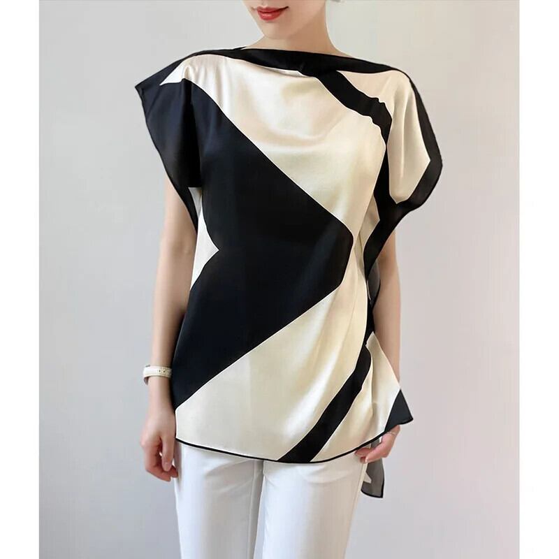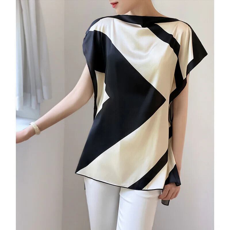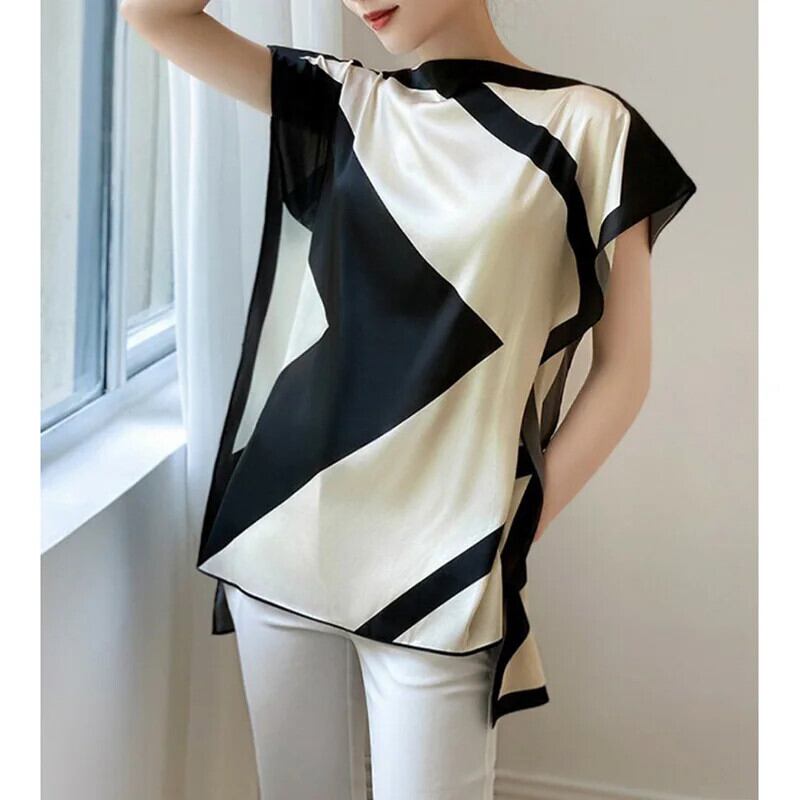 送料無料 スラッシュネックプリントバットウィングスリーブ不規則なブラウス女性の 2024 夏プルオーバー非対称シャツ サマー 夏物 AE1288776610011877631