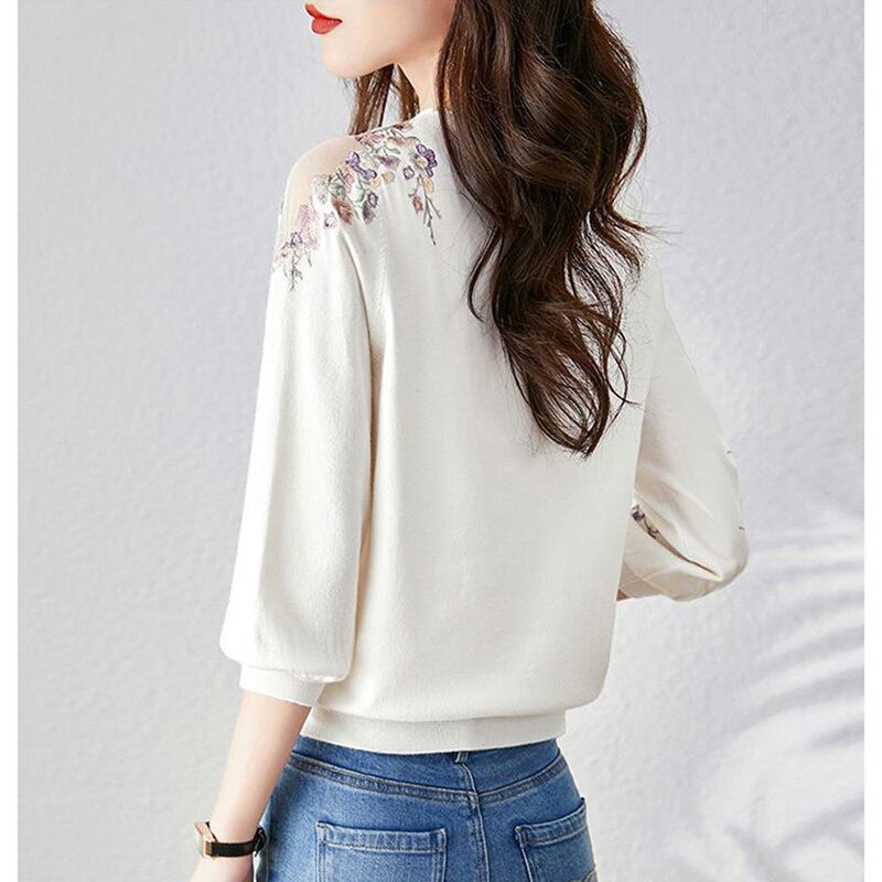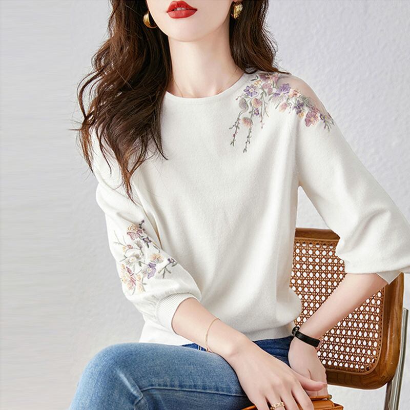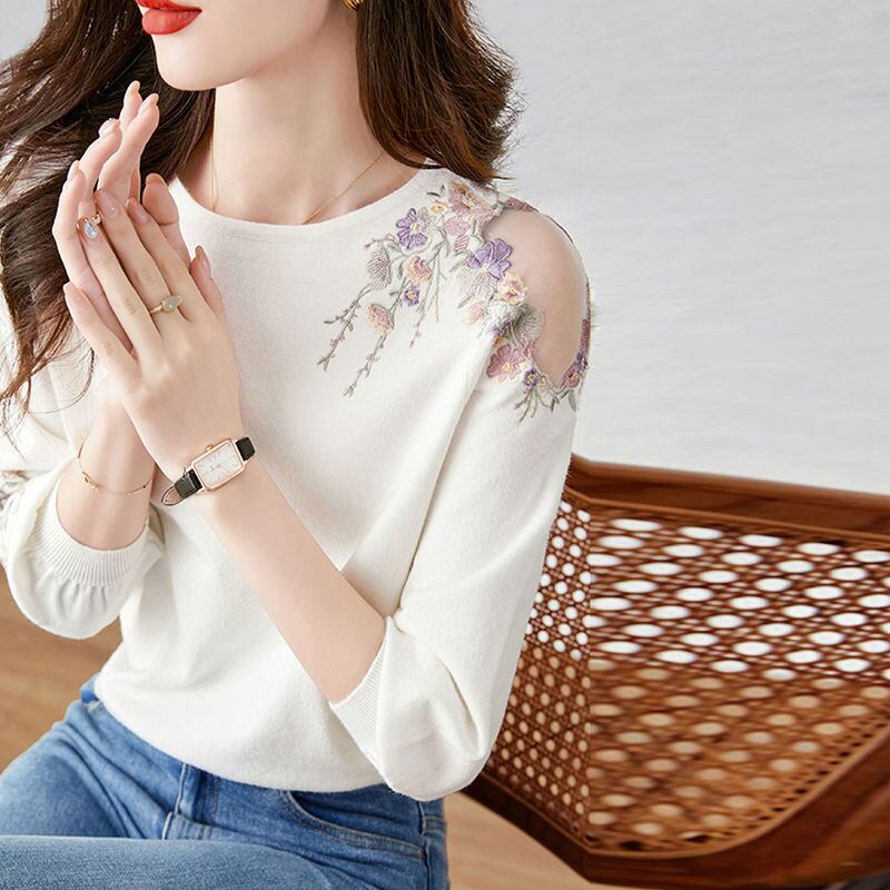 送料無料 スタイリッシュなルーズニット折り目オフショルダー刺繍ブラウス 2023 夏プルオーバートップスシャツ サマー 夏物 AE1288776640847414363