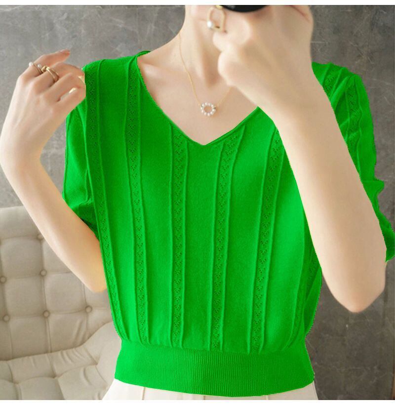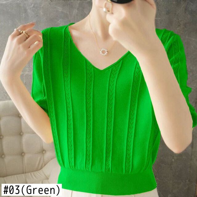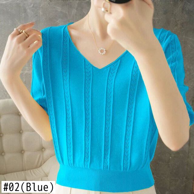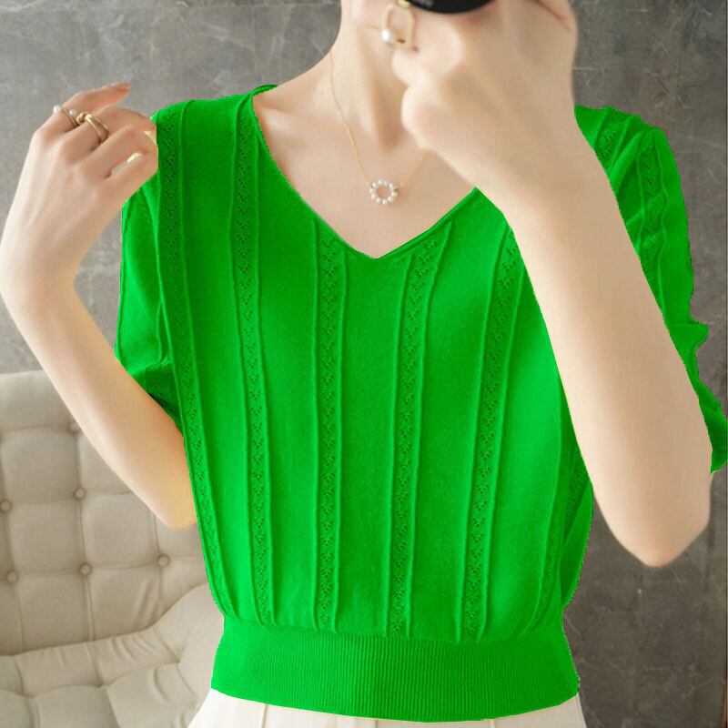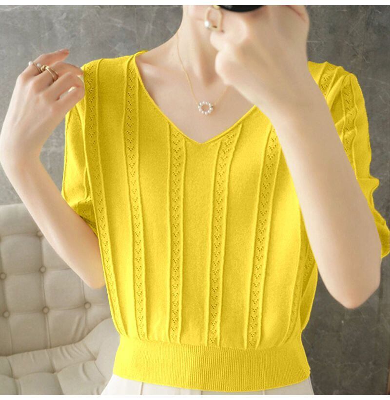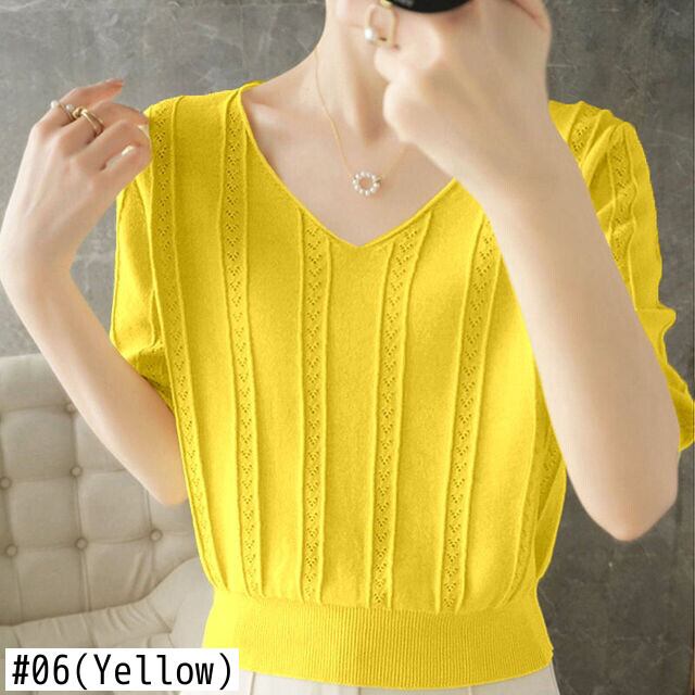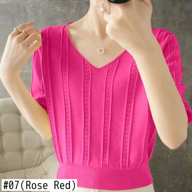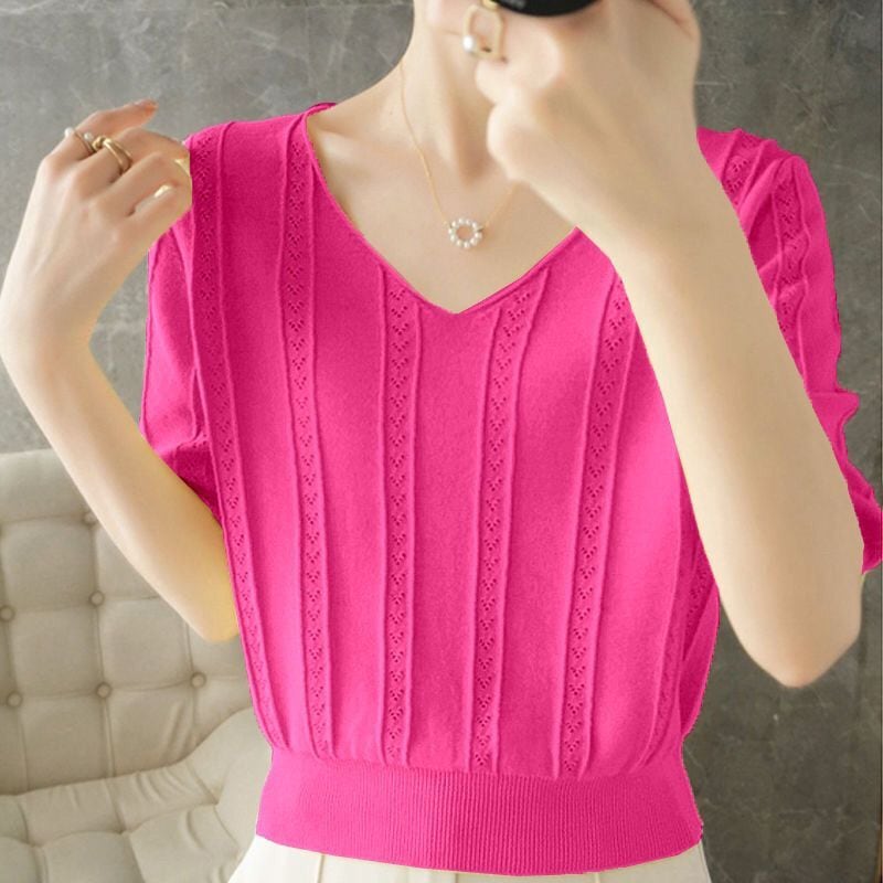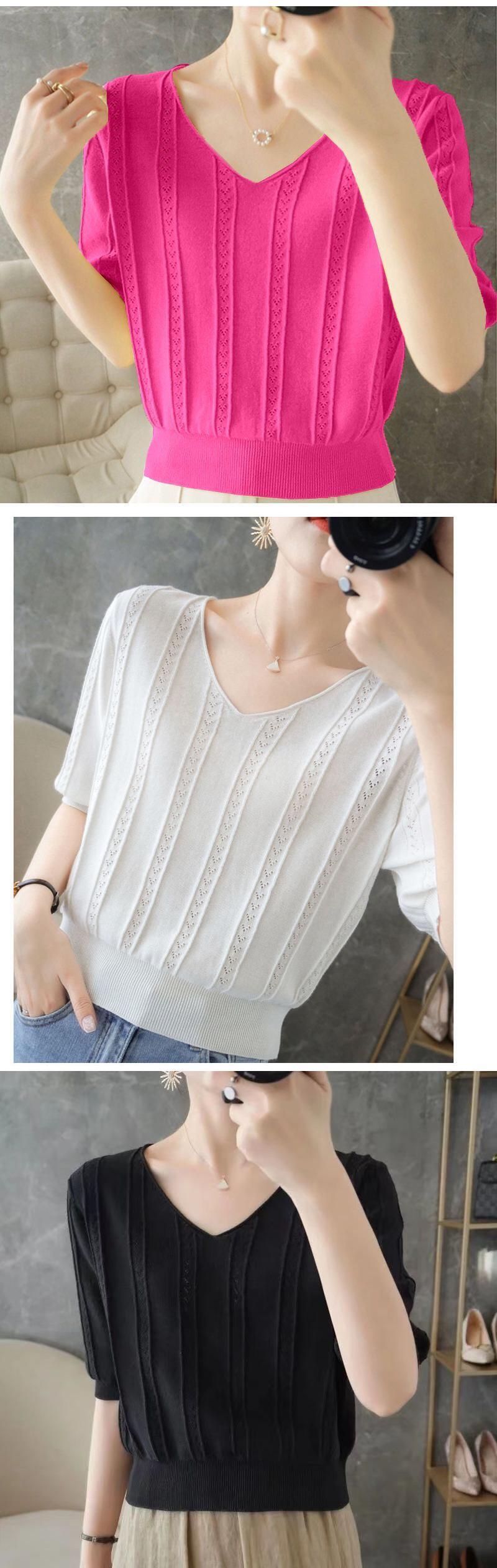 送料無料 V ネックソリッドカラーニット中空アウト Tシャツ女性の 2024 夏ルーズトップス通勤 Tシャツ サマー 夏物 Vネック AE12887766159677348