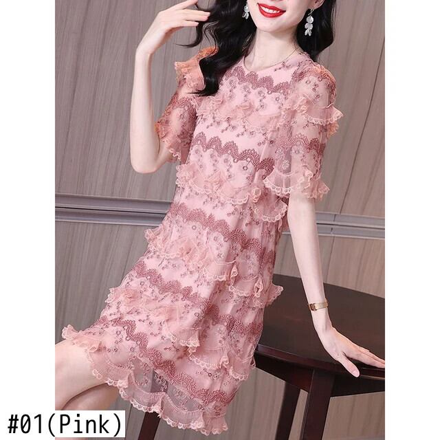 送料無料 O ネックスプライシングガーゼフリル刺繍パーティードレス女性の 2024 夏ルーズスリーブレースドレス ラッフル サマー 夏物 Oネック AE128877662431554815