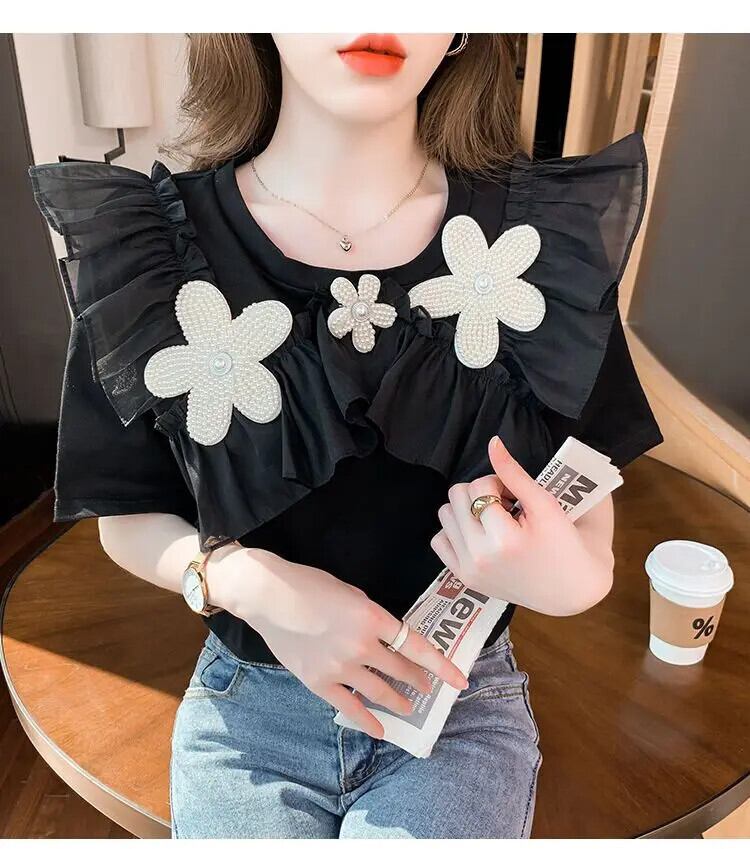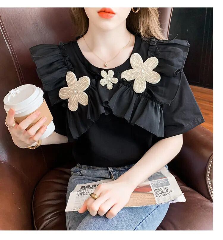 送料無料 O ネックスプライシングビーズフリル折り目ブラウス 2023 夏プルオーバー半袖甘いシャツ ショート ハーフスリーブ ラッフル 大人ガーリー スウィート キュート カジュアル サマー 夏物 Oネック AE1288776628893684834
