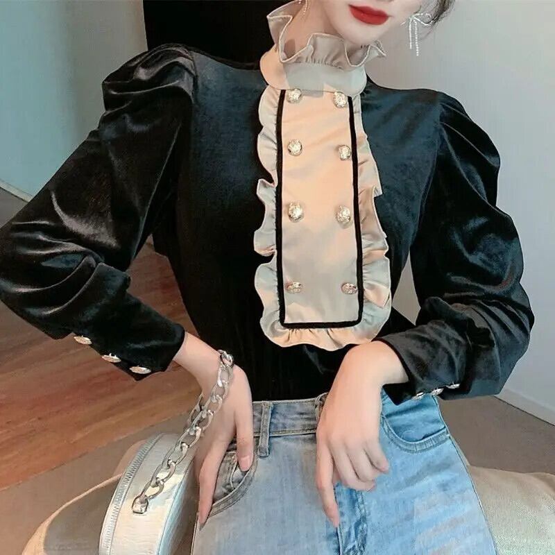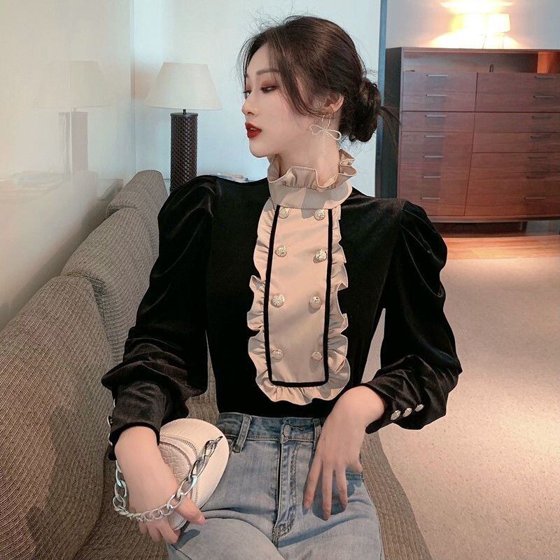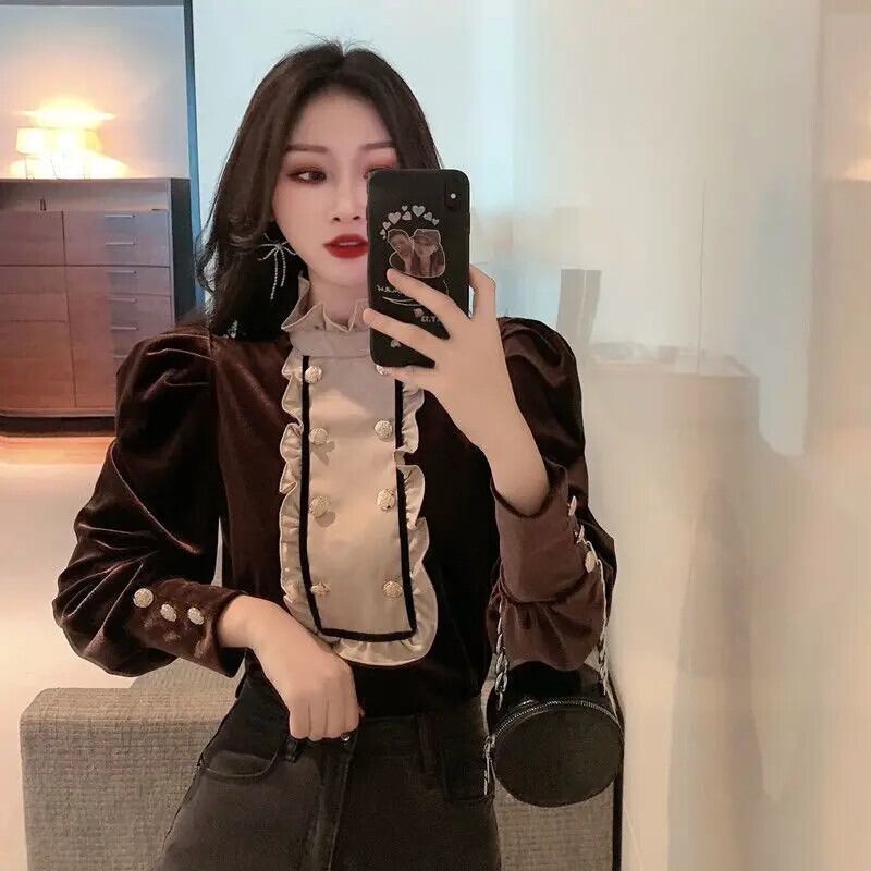送料無料 バタフライスリーブスプライシングボタンフリルパフスリーブブラウス女性の 2023 冬プルオーバー甘いシャツ ラッフル 大人ガーリー スウィート キュート カジュアル ウィンター 冬物 AE128877663800393566
