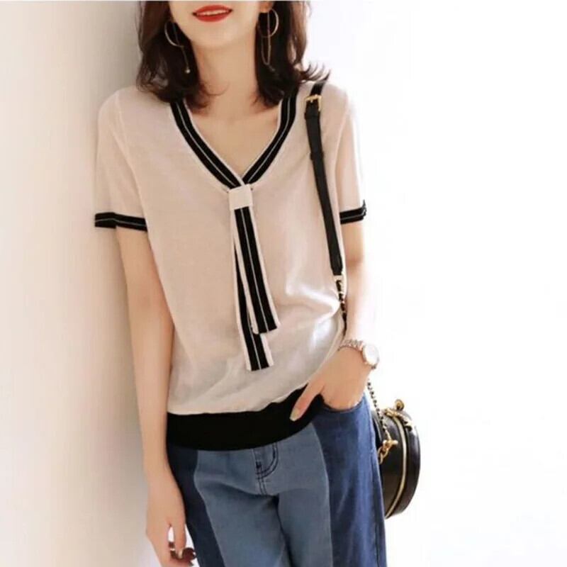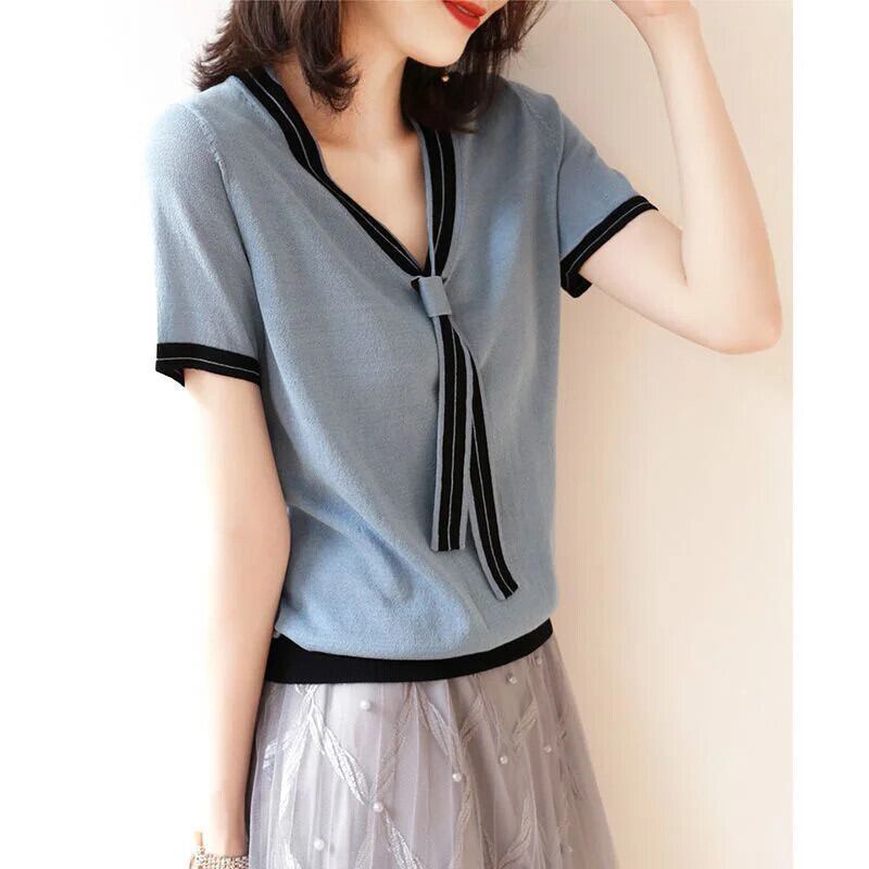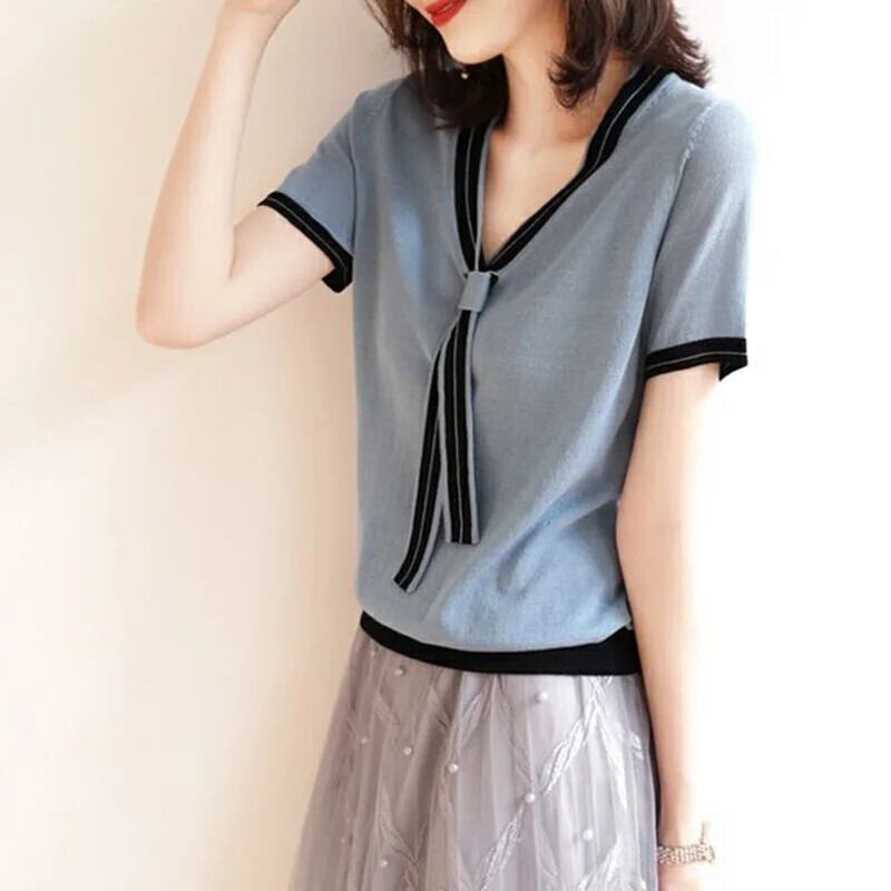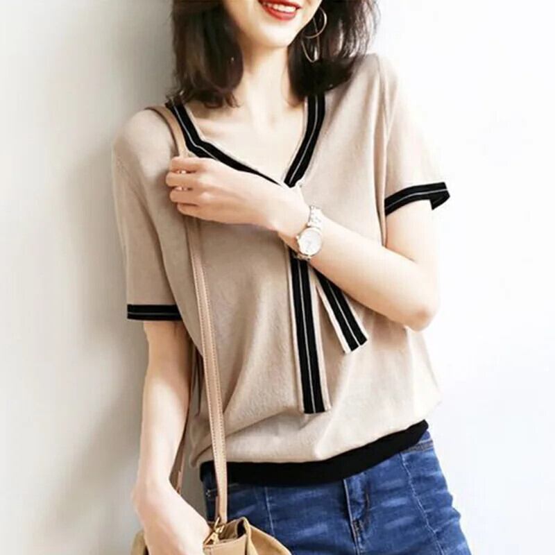 送料無料 Vネックニットスプライシングルーズレースアップブラウス2023夏プルオーバー半袖シャツ ショート ハーフスリーブ サマー 夏物 AE1288776648478403222