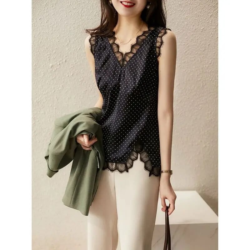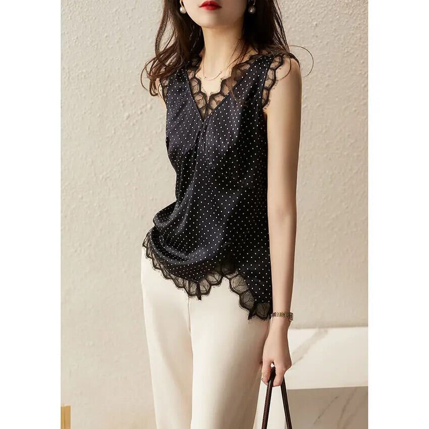 送料無料 水玉ノースリーブレースブラウス女性の 2023 春プルオーバートップスシフォン通勤シャツ スプリング 春物 AE1288776629981721511