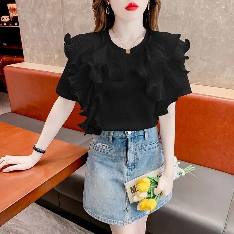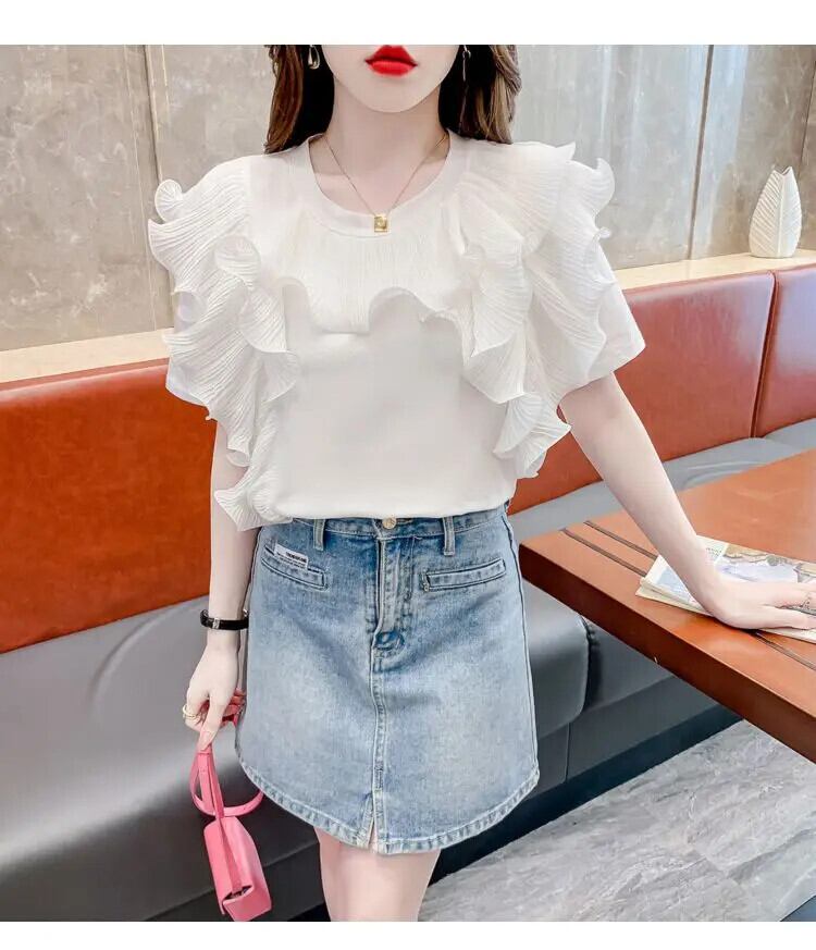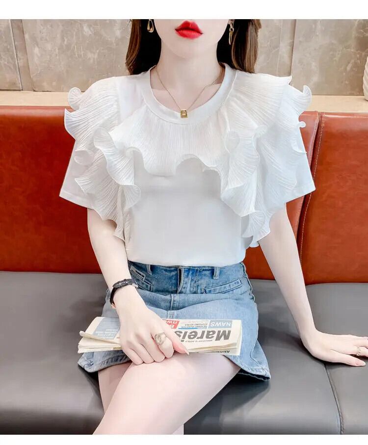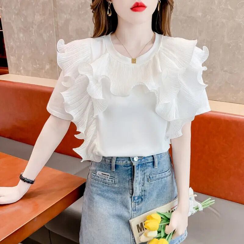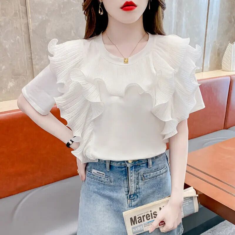 送料無料 O ネックスプライス半袖フリルブラウス女性の 2023 夏プルオーバーオフィスレディシャツ ショート ハーフスリーブ ラッフル サマー 夏物 Oネック 会社 学校 通勤や通学にも AE1288776697735768469