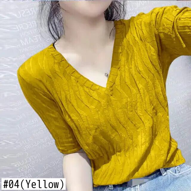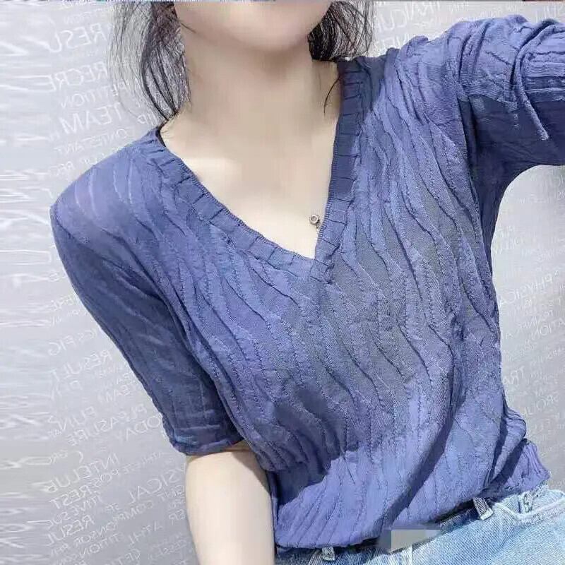 送料無料 V ネックソリッドカラーひだ Tシャツ女性の 2024 夏スリムニットトップスオフィスレディ Tシャツ サマー 夏物 Vネック 会社 学校 通勤や通学にも AE1288776649145997339