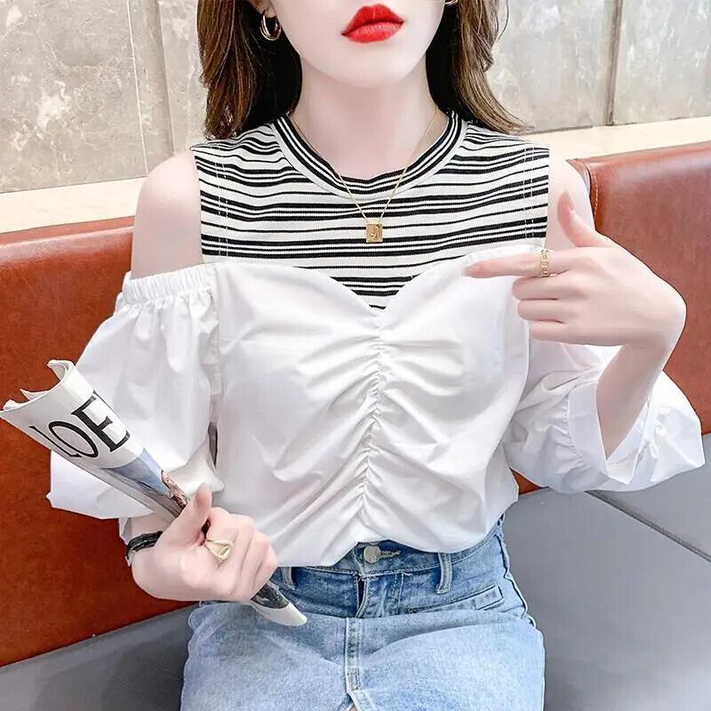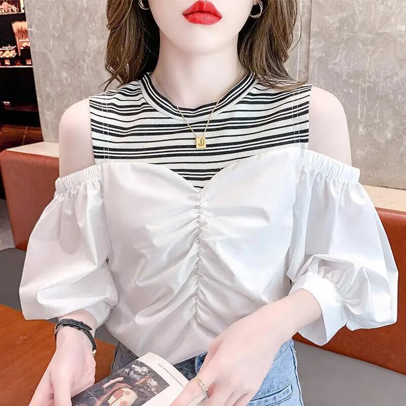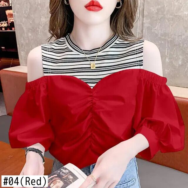 送料無料 甘い中空折り目オフショルダーフェイクツーピースブラウス 2023 オーバーサイズトップスストライプパフスリーブシャツ 大人ガーリー スウィート キュート カジュアル AE1288776698573722801