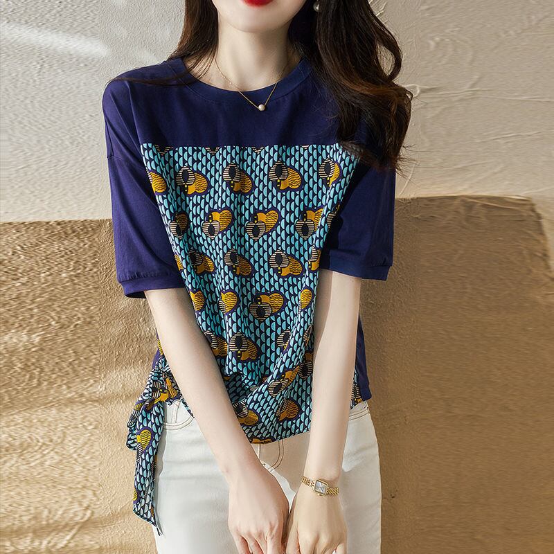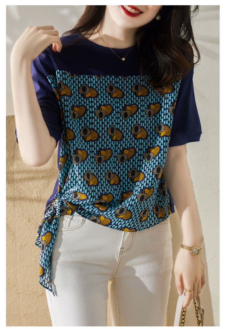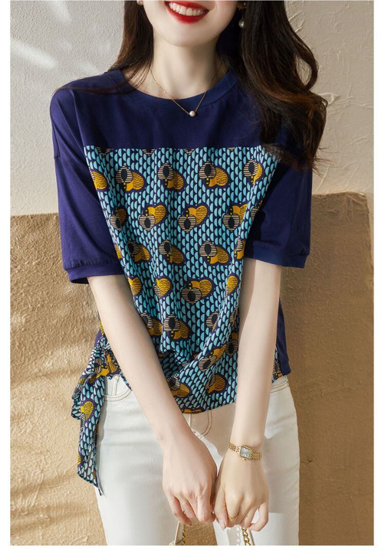 送料無料 ヴィンテージプリントスプライシングレースアップボウ不規則なブラウス女性の 2023 夏オーバーサイズトップス半袖シャツ ショート リボン ハーフスリーブ サマー 夏物 ビンテージ AE1288776632353131771