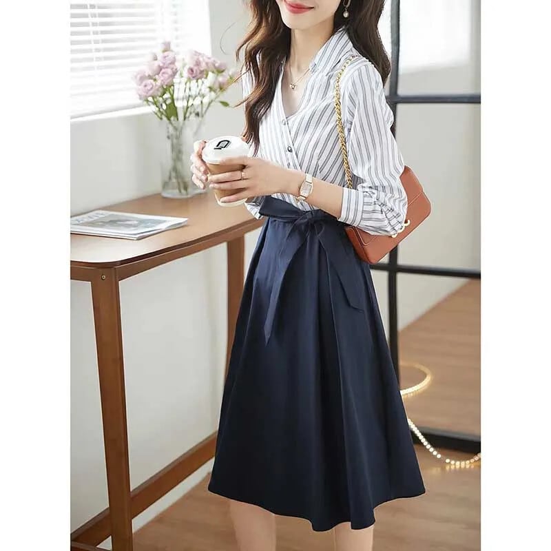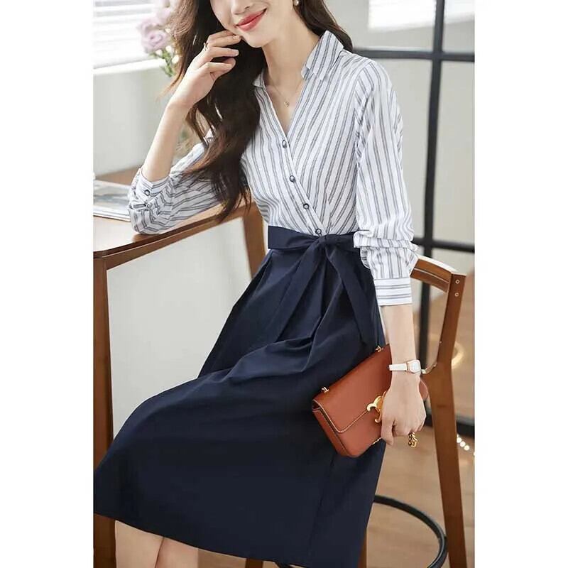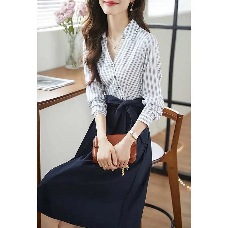 送料無料 ストライプスプライシング包帯フェイクツーピースミディドレス女性の2024春ルーズオフィスレディドレス スプリング 春物 会社 学校 通勤や通学にも AE1288776656836678668