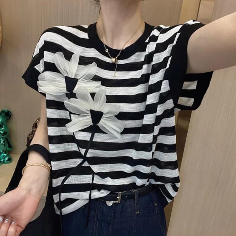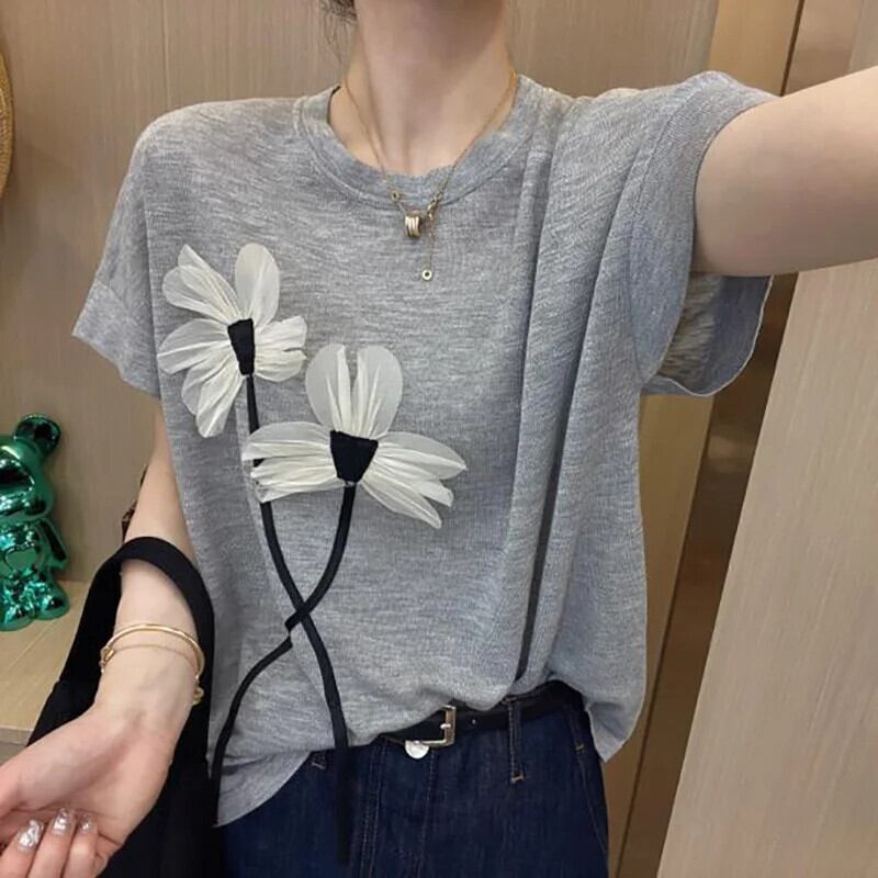 送料無料 O ネックスプライスニットバットウィングスリーブ Tシャツ女性の 2024 夏ルーズトップス Tシャツ サマー 夏物 Oネック AE1288776642557225641