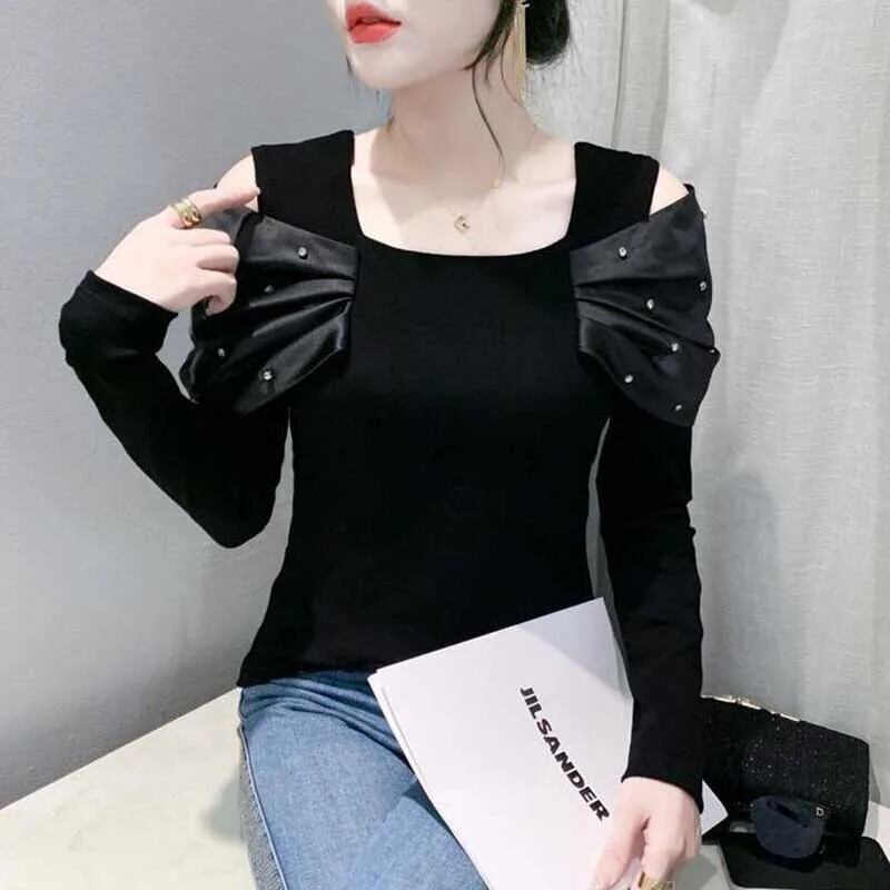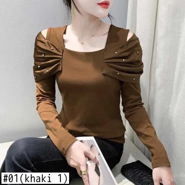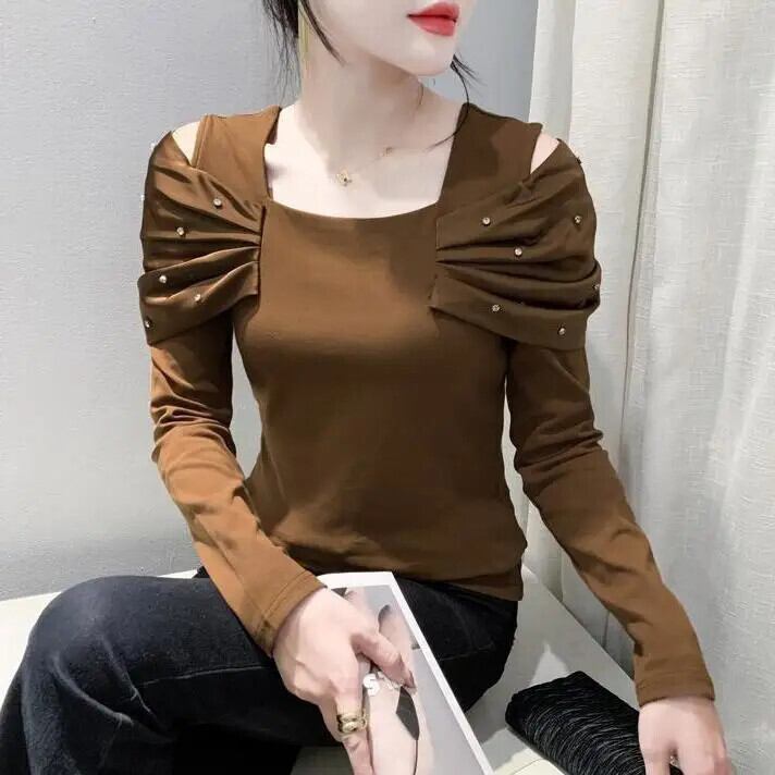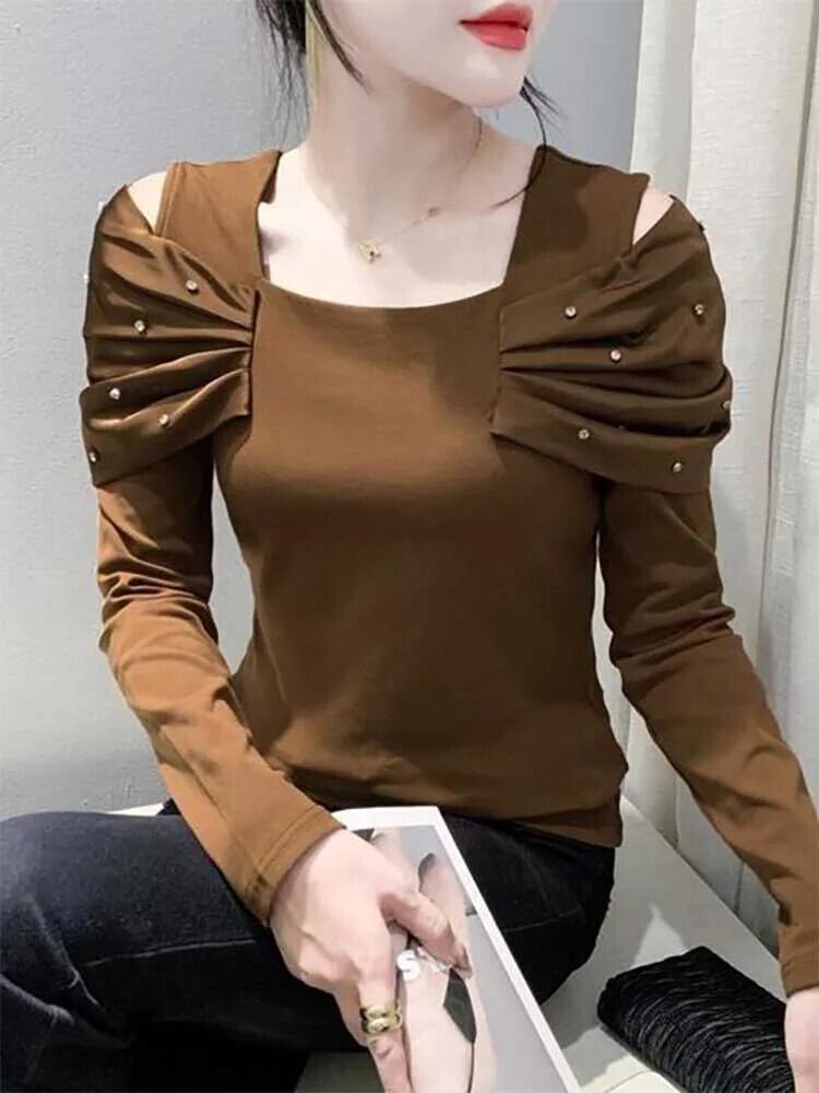 送料無料 O ネックスプライス折り目ダイヤモンドオフショルダーブラウス女性の 2024 春スリムオフィスレディトップスシャツ スプリング 春物 Oネック 会社 学校 通勤や通学にも AE1288776621693796408