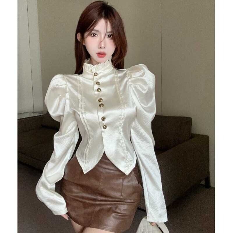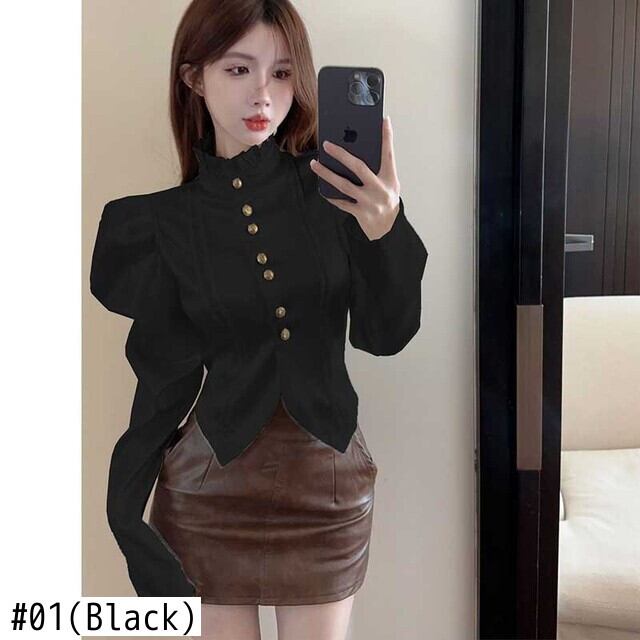 送料無料 スタンドカラーフリルスプライシングパフスリーブシャツ女性の2024春スリムトップスオフィスレディブラウス ラッフル スプリング 春物 会社 学校 通勤や通学にも AE1288776679366493354
