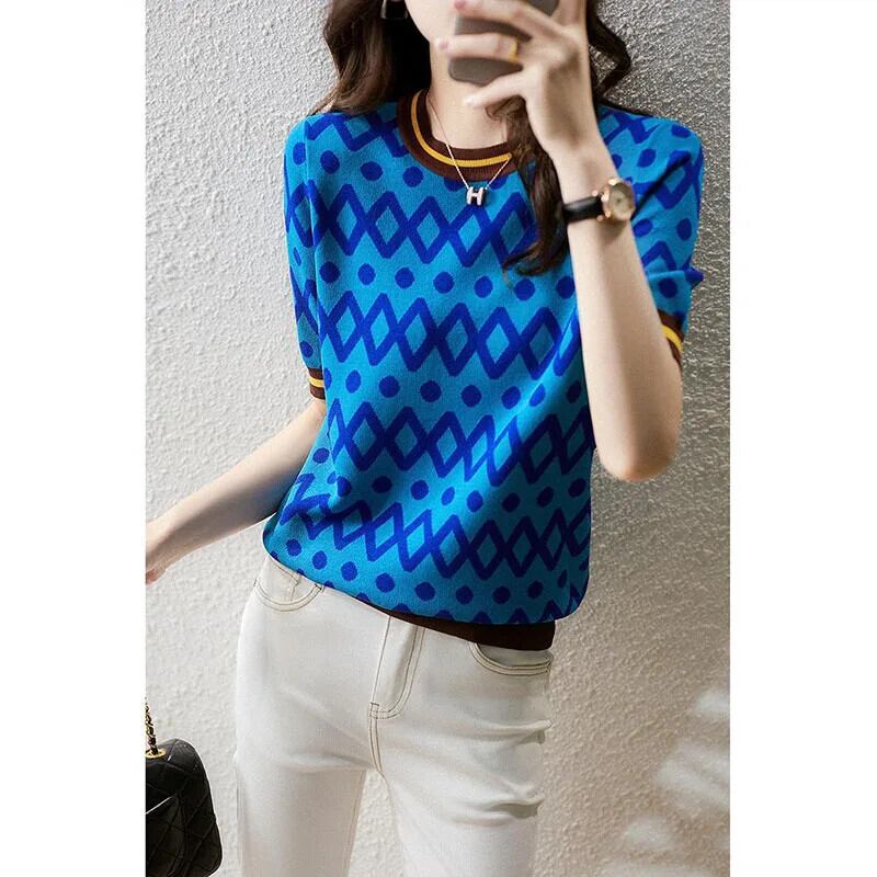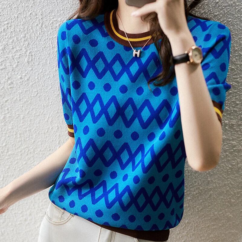 送料無料 ヴィンテージプリント O ネックスプライスストライプチェック柄ブラウス女性の 2024 夏プルオーバールーズ通勤シャツ サマー 夏物 Oネック ビンテージ AE1288776663645472743