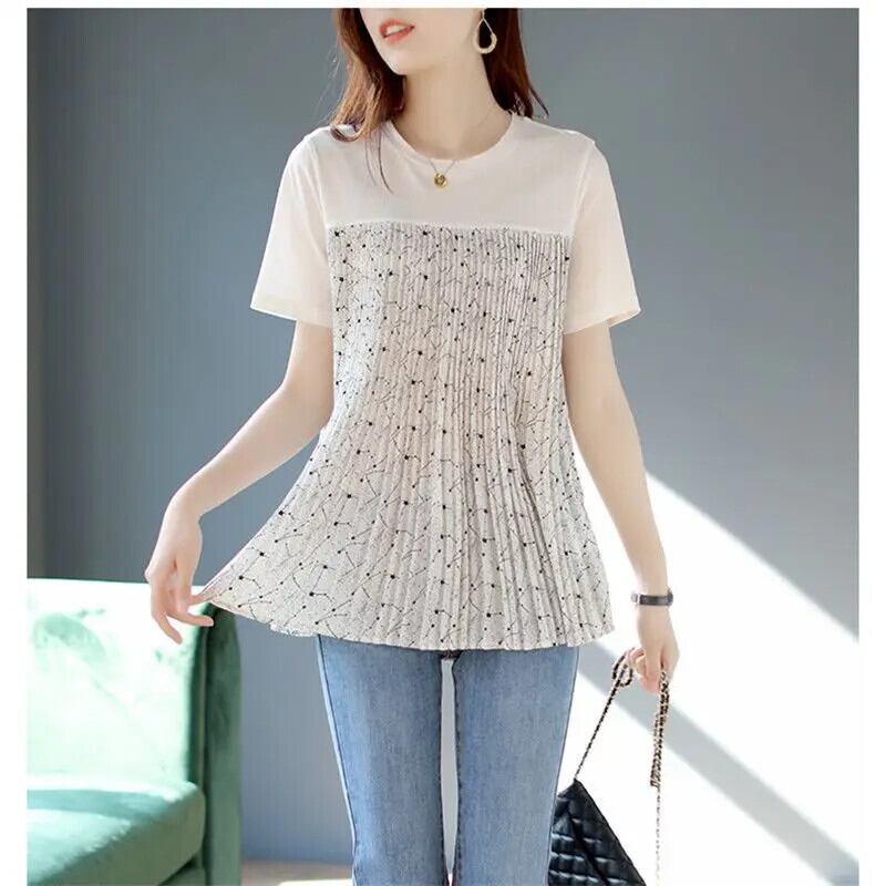 送料無料 O ネックプリントスプライシング折り目シフォンブラウス女性の 2024 夏ルーズオールマッチトップス通勤シャツ サマー 夏物 Oネック AE1288776658362567379