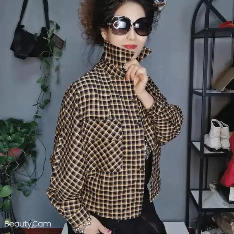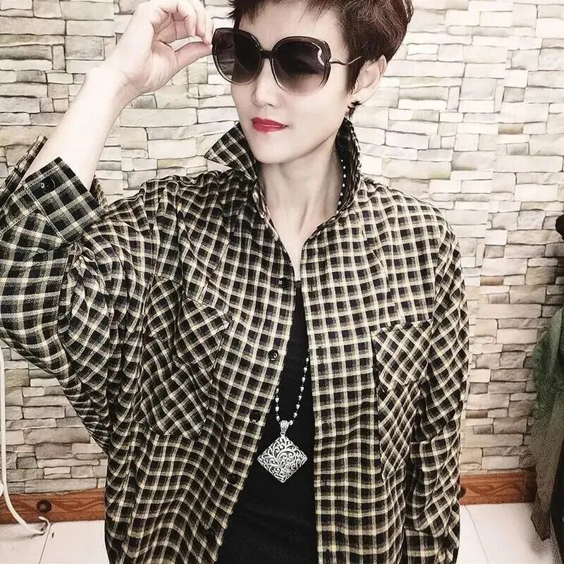 送料無料 ラペルスプライシングバットウィングスリーブチェック柄シャツ女性の 2024 春ルーズオールマッチトップス通勤ブラウス スプリング 春物 AE1288776624445023963