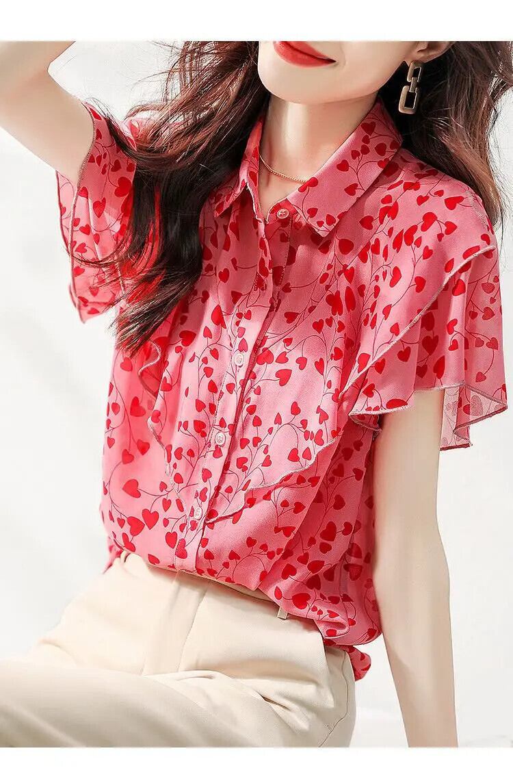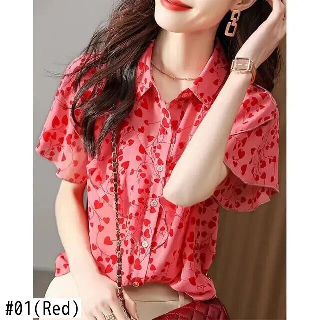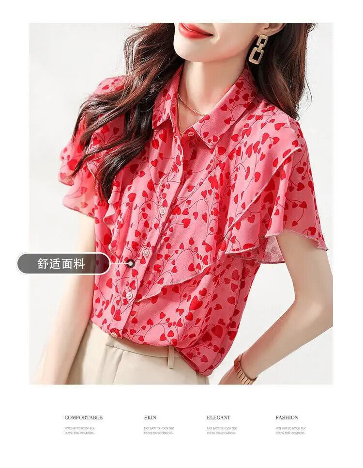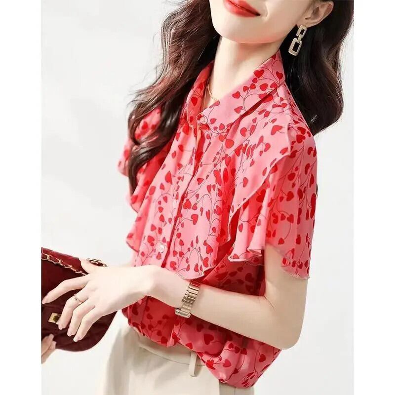 送料無料 ラペルスプライシングフリルプリントシャツ女性 2023 夏特大トップス半袖オフィスレディブラウス ショート ハーフスリーブ ラッフル サマー 夏物 会社 学校 通勤や通学にも AE1288776639643297588
